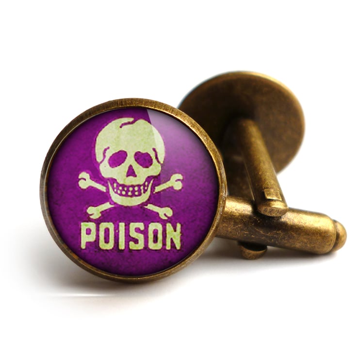 A beautiful pair of cufflinks featuring an image of a vintage poison warning. This design is part of the 'Dark Journey' range.