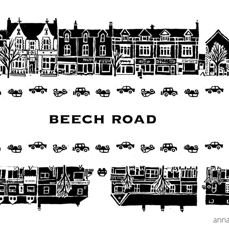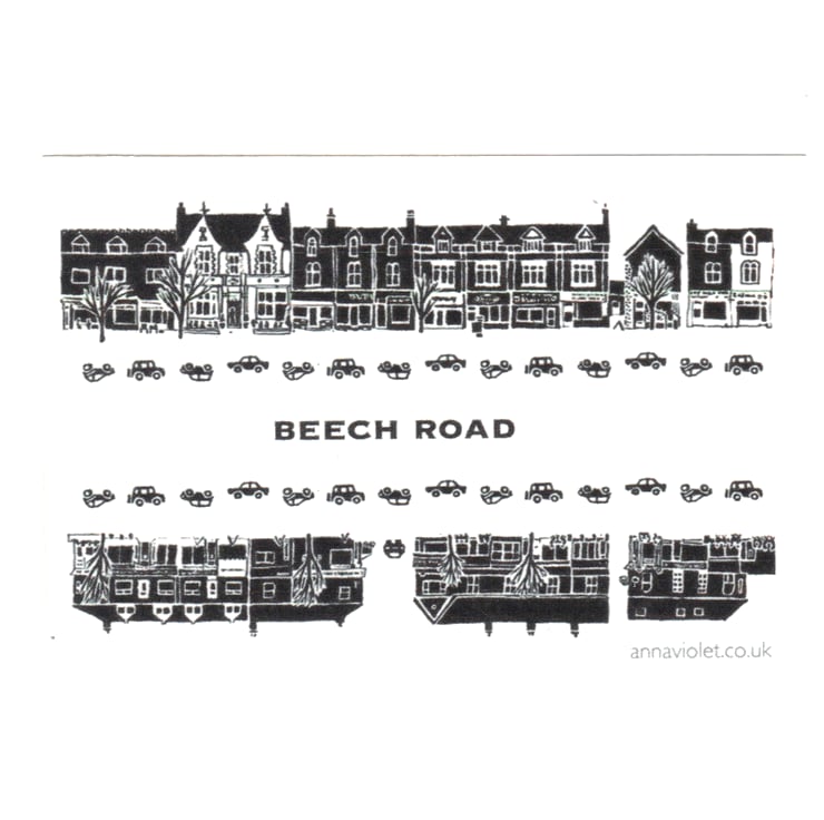 From an original hand-painted design by Anna Violet of a section of Chorlton's busy Beech Road.