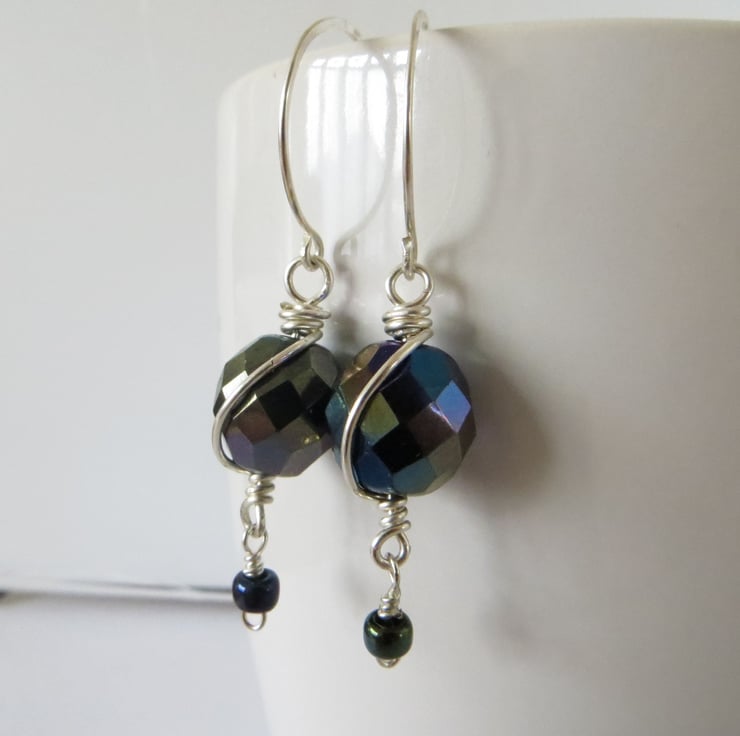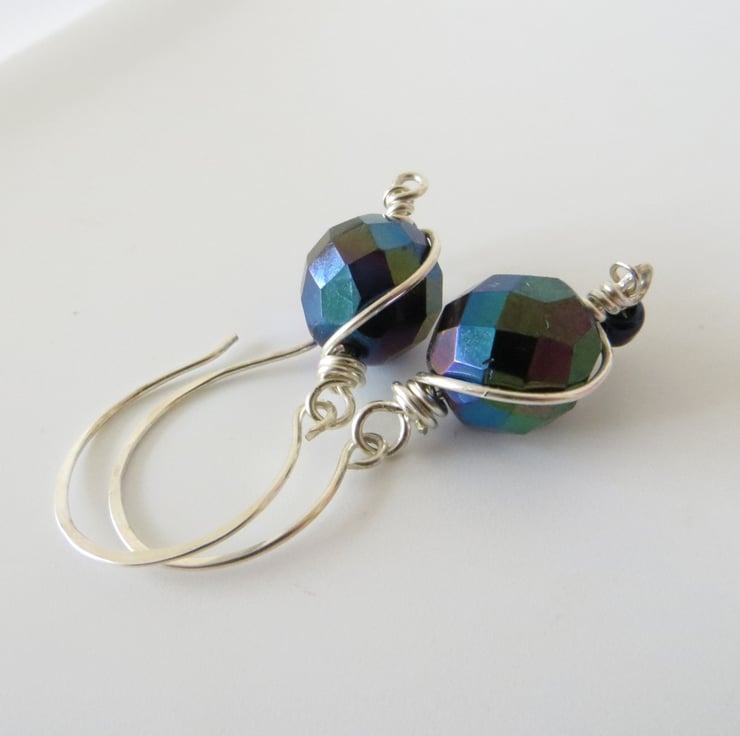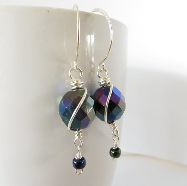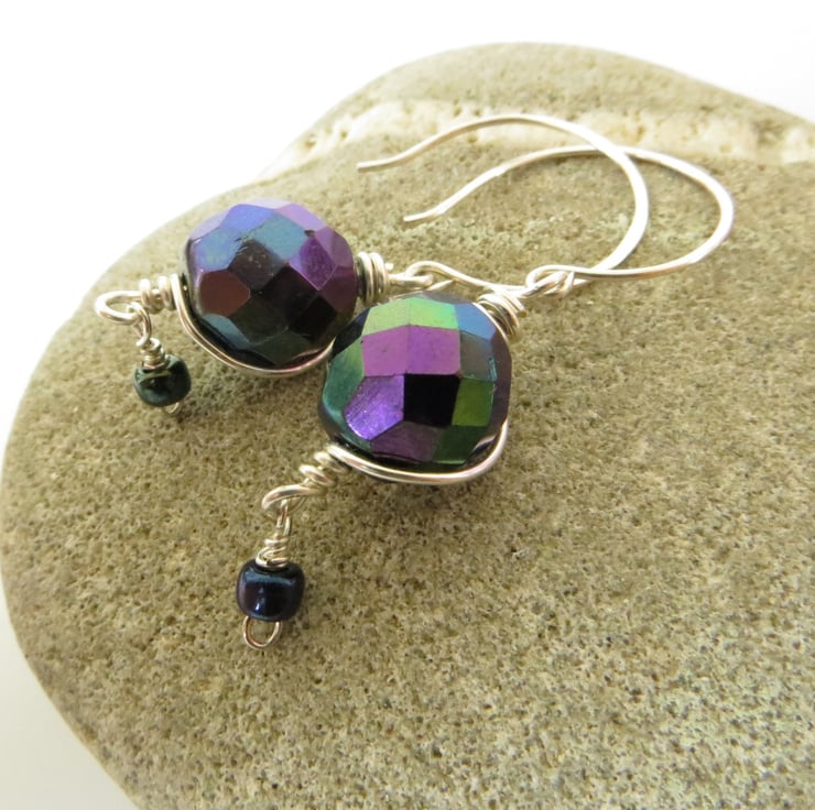 These elegant earrings feature large black faceted beads with an iridescent oil slick coating - they shimmer and shine purple, pink, green and blue depending on how the light catches them, almost like beetle wings! They have been wrapped around with silver plated wire and a teeny little matching bead dangles from the end giving a lovely bit of movement. They are hung from hand crafted silver plated earwires which have been hammered for durability.