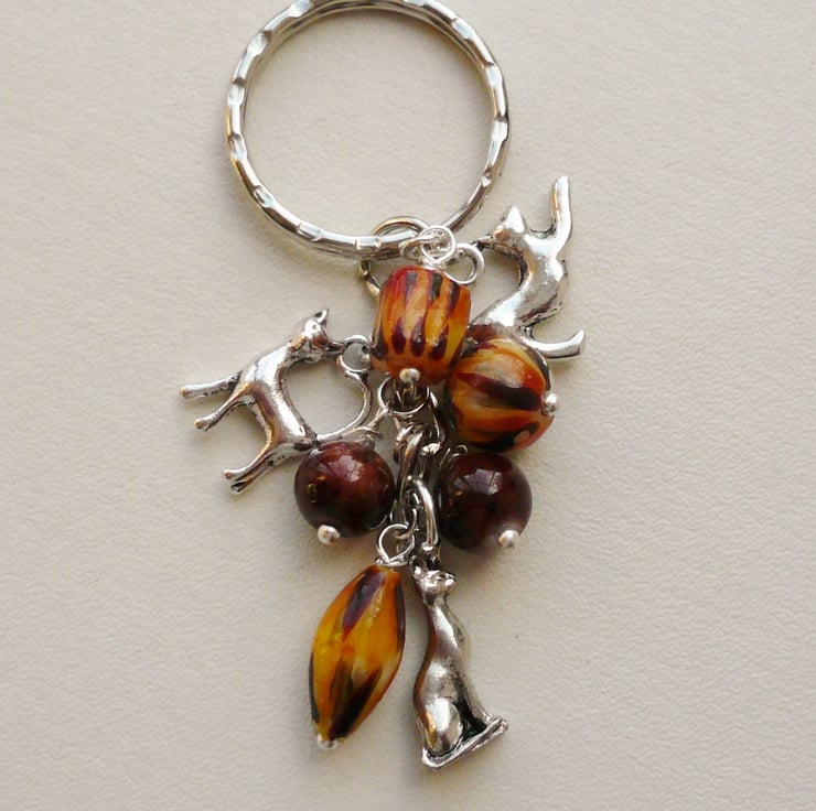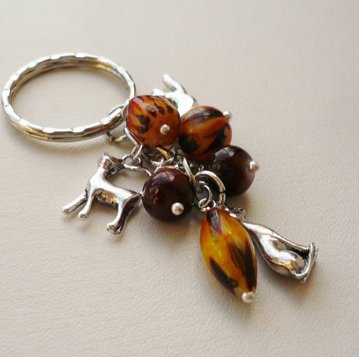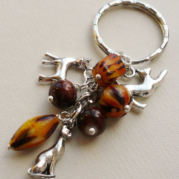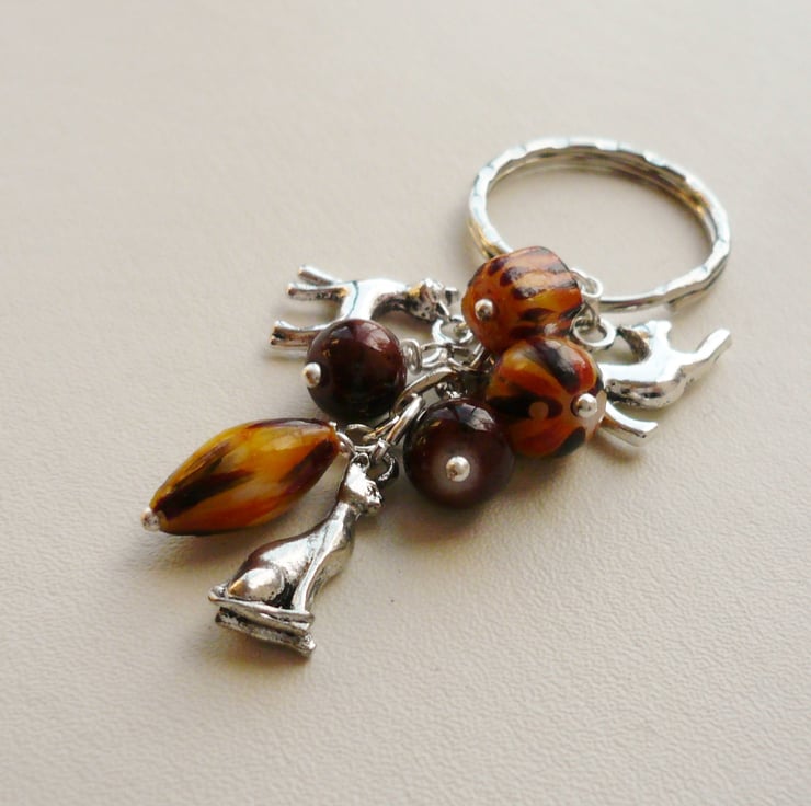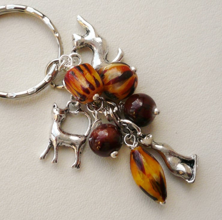This cute little keyring is made up of three cat/tiger print glass beads with co-ordinating round brown marble-effect glass beads which measure approx 8mm - 15mm. Also includes three different Tibetan silver cat charms and are all attached to a silver plated 25mm keychain.