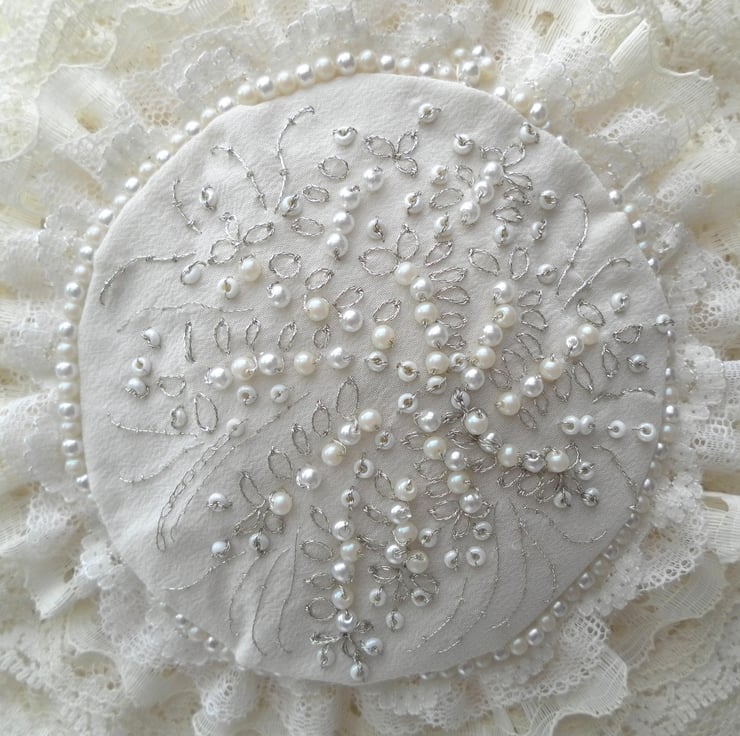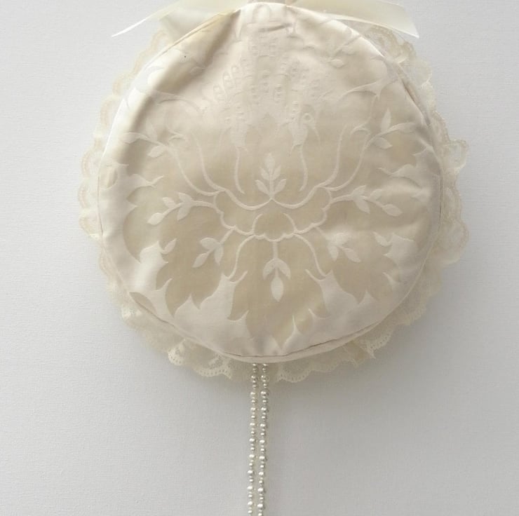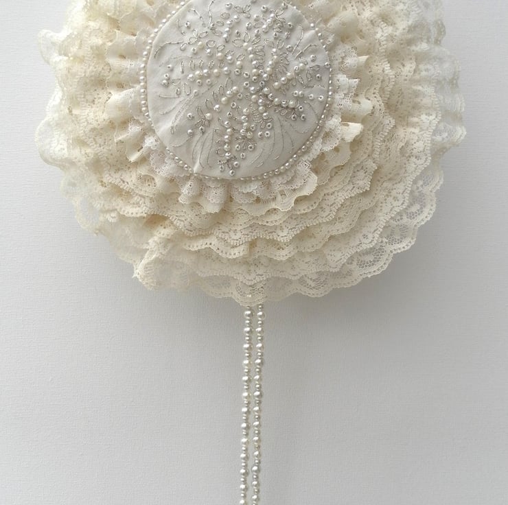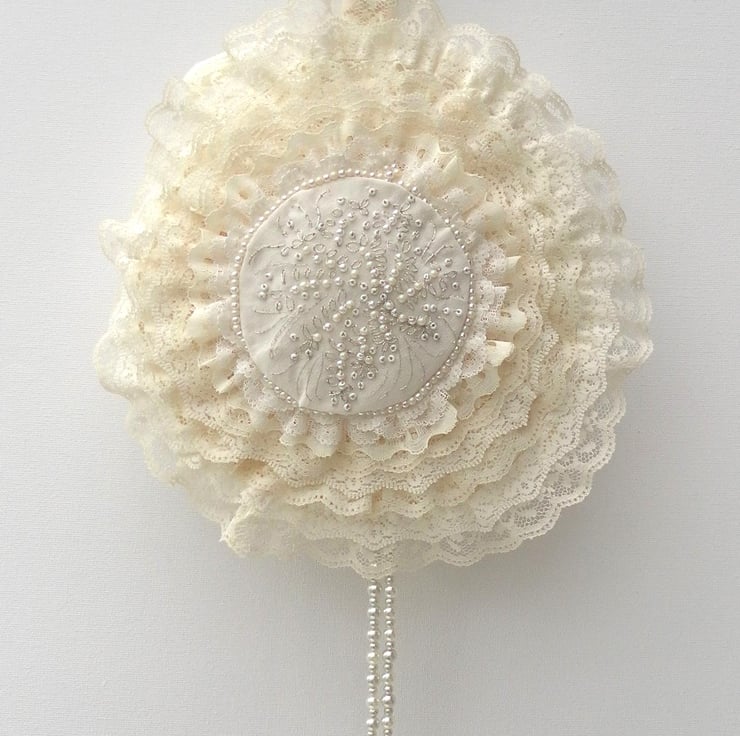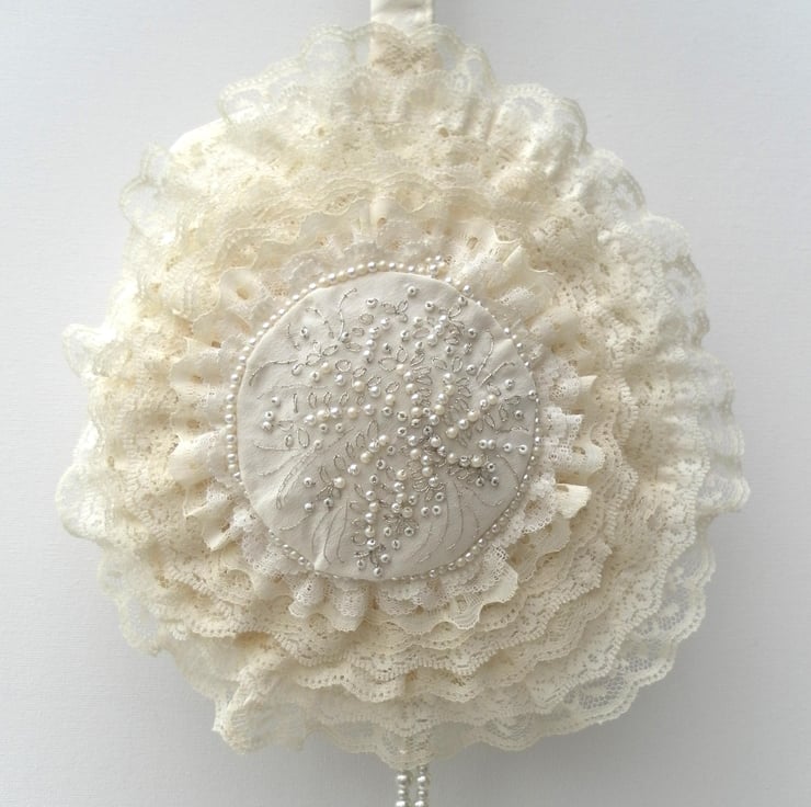 This beautiful bridal bag is perfect for a wedding as an alternative to a bouquet. It is one of a kind and would be unique to you! It has eight overlapping circular layers of lace in shades of cream, surrounding a hand sewn, central floral motif of beads and silver embroidery on cream silk, edged with a circlet of matching beads. The sides, back and handle of the bag are cream satin with a leaf motif. There is an extravagant beaded hanging “tassel”. The bag has a cream satin ribbon bow closure and is lined with a plain cream satin and has a small internal pocket. The bag is interfaced to give structure and strength. Total length from the top of the handle to the bottom of the “tassel” is 61cm. The bag itself is 18cm in diameter and 4cm wide.