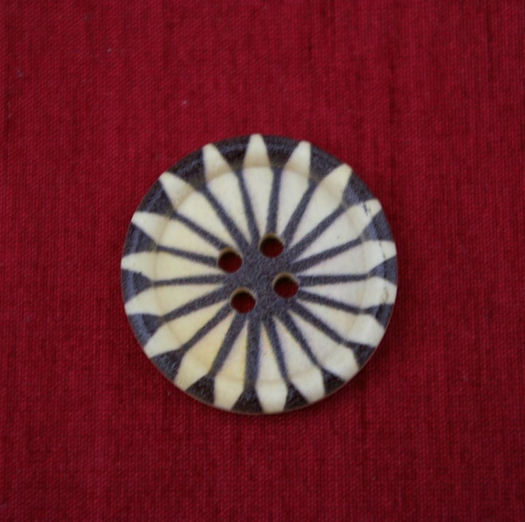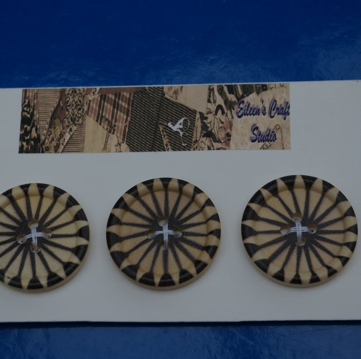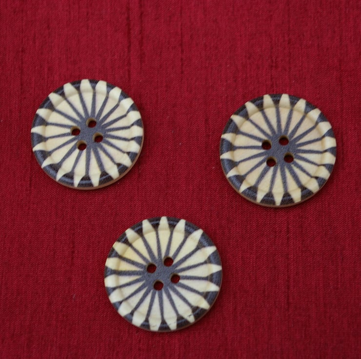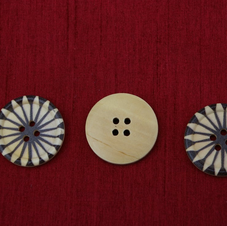 This is a set of three large wooden buttons. They are decorated with a printed design in black which gives the effect of a stylized flower. Each button has four sewing holes.