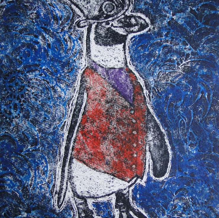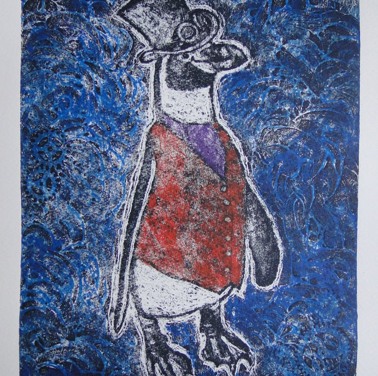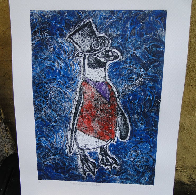 Four colour Collagraph Print of a very dapper steampunk penguin in his waistcoat and cravat. Limited edition of 15.