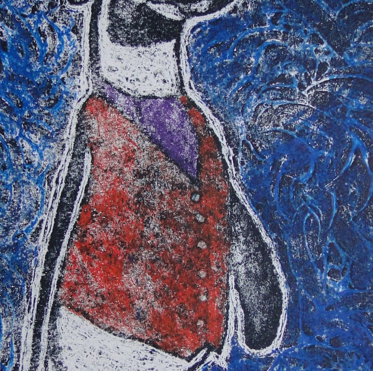 Hand printed on 300gm acid free watercolour paper in blue/black oil based ink with blue coloured background.