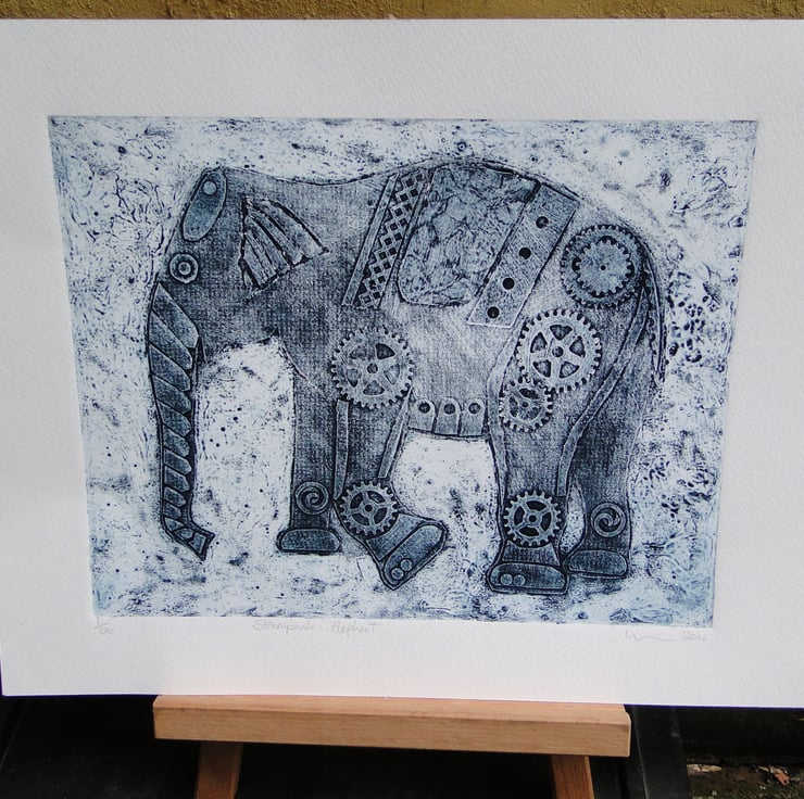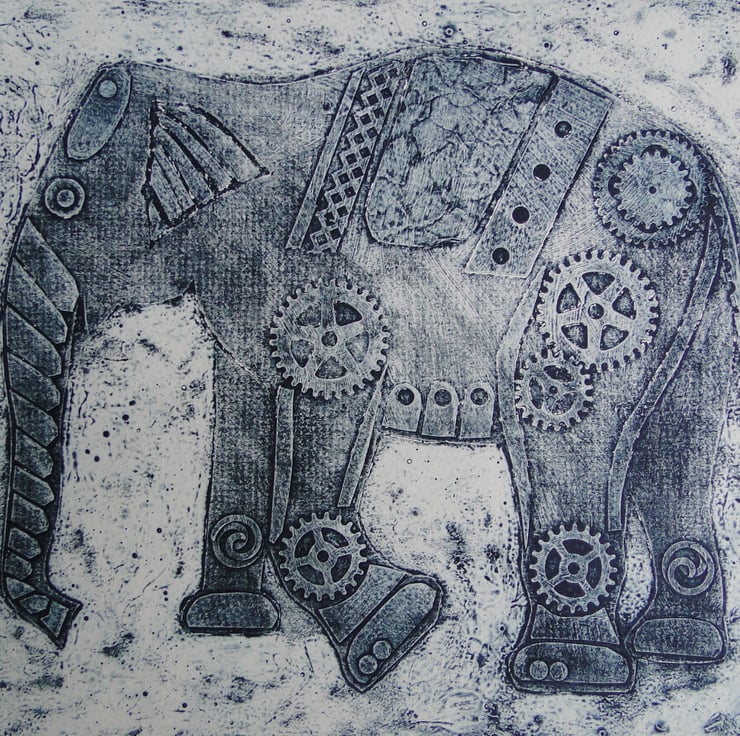 Collagraph Print of a steampunk elephant complete with cogs. Limited edition of 20.