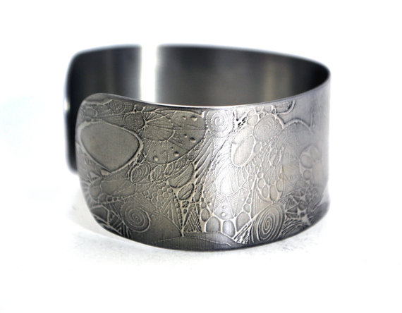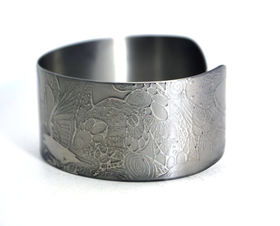 This steel silver cuff has the image of two rooks flying towards each other etched onto the surgical steel surface, polished to create definition and contrast. I use environmentally friendly etching processes when producing my designs, and each piece is subtly unique. This will not tarnish as it is polished stainless steel: it is often mistaken as silver, but I would say it is more the colour of raw platinum.
