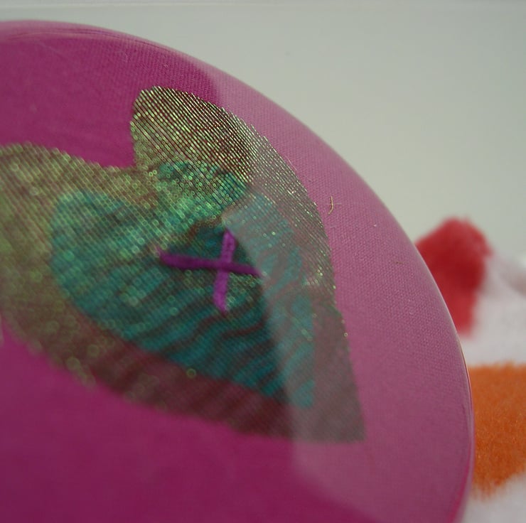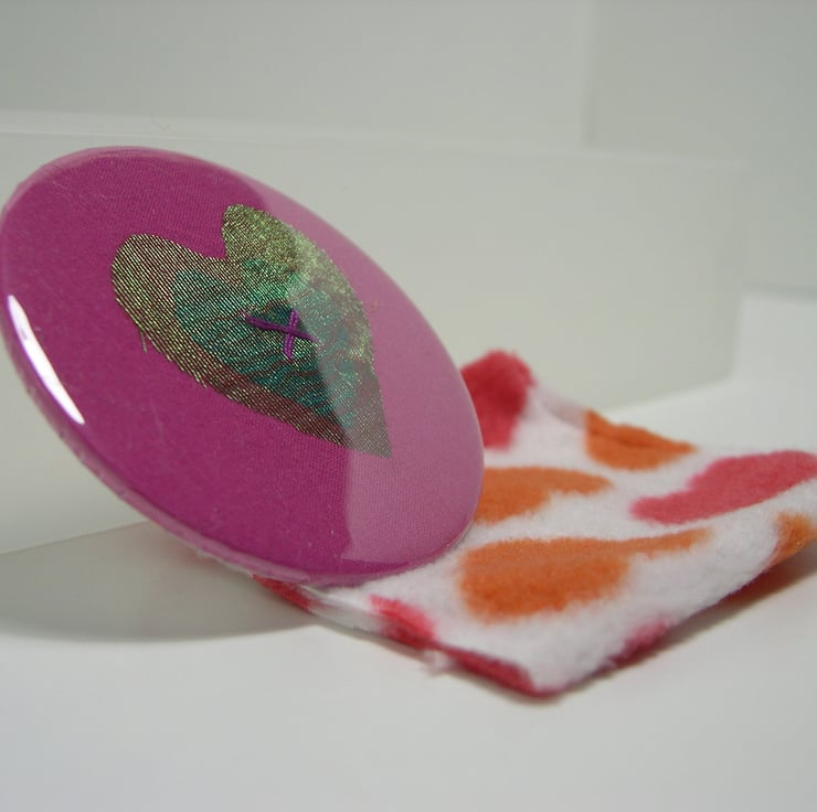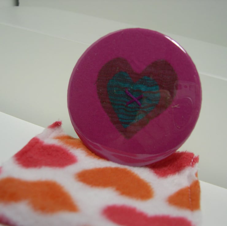 A bold pink recycled textile pocket mirror with a sweet love heart motif in two tone red / green with a little kiss stitched in the centre - a perfect gift for a special person!