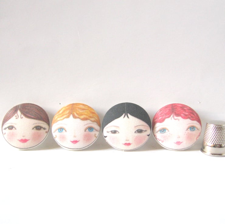 Covered Buttons - Doll Face Fabric Buttons (Set of 4) with Delphine, Pernille, Su Lin and Kirstie doll faces