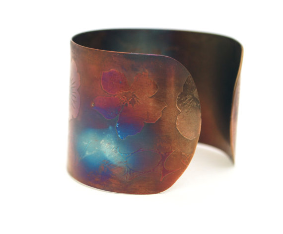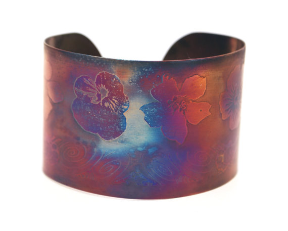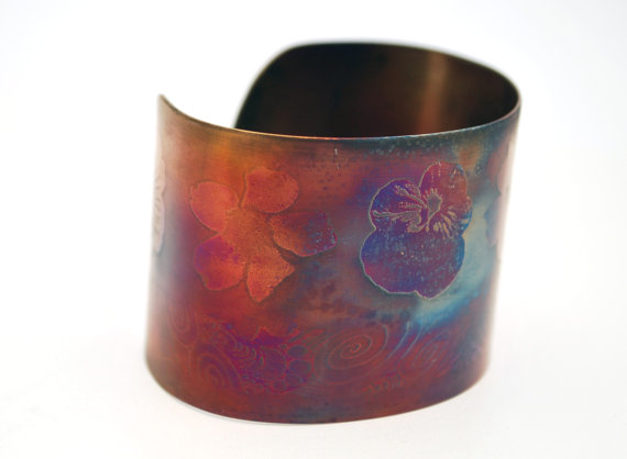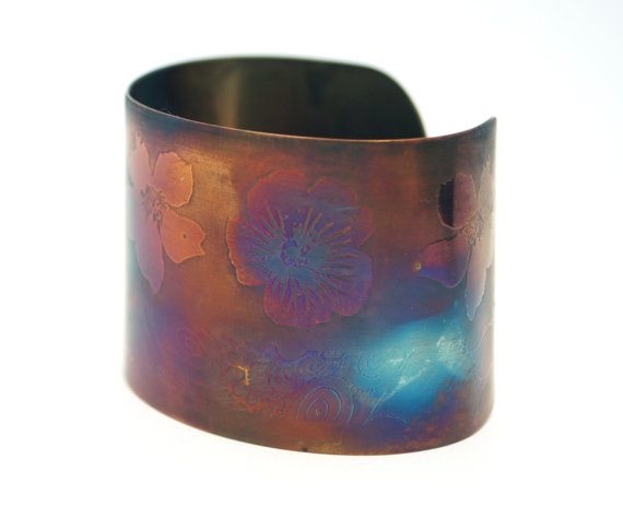 This coloured steel cuff has the image of flowers over a patterned band etched onto the surgical steel surface, polished to create definition and contrast. I use environmentally friendly etching processes when producing my designs, and each piece is subtly unique. This piece has been vibrantly coloured using a jewellers torch (a technique called 'bluing') and finished to preserve the very durable patina. This will not tarnish further as it is polished stainless steel.