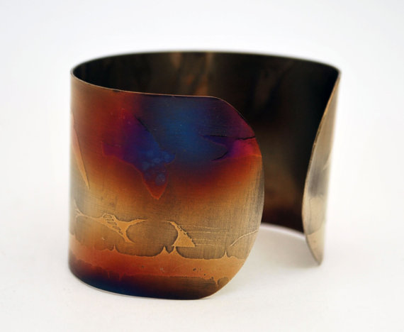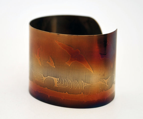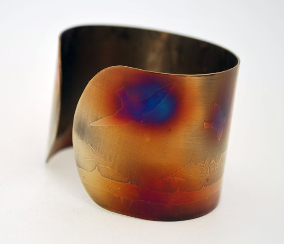 This coloured steel cuff has the image of birds flying over a band of thorns and pattern etched onto the surgical steel surface, polished to create definition and contrast. I use environmentally friendly etching processes when producing my designs, and each piece is subtly unique. This piece has been vibrantly coloured using a jewellers torch (a technique called 'bluing') and finished to preserve the very durable patina. This will not tarnish further as it is polished stainless steel.