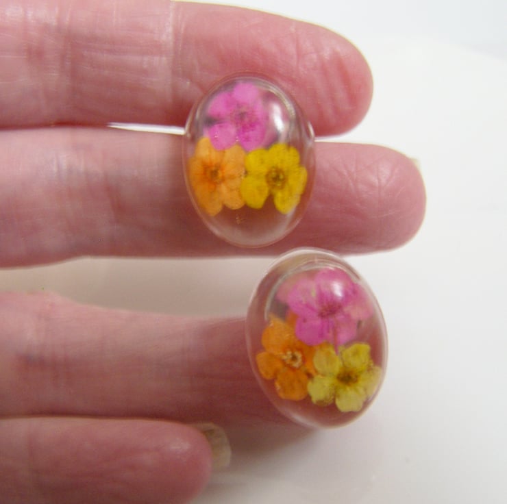 Description: Cute little orange, yellow and pink dried flowers have been set in clear UV resistant, non toxic resin.. measures approx 20mm x 15mm on silver plated ear posts with butterfly backs. So pretty, cheerful and summery.