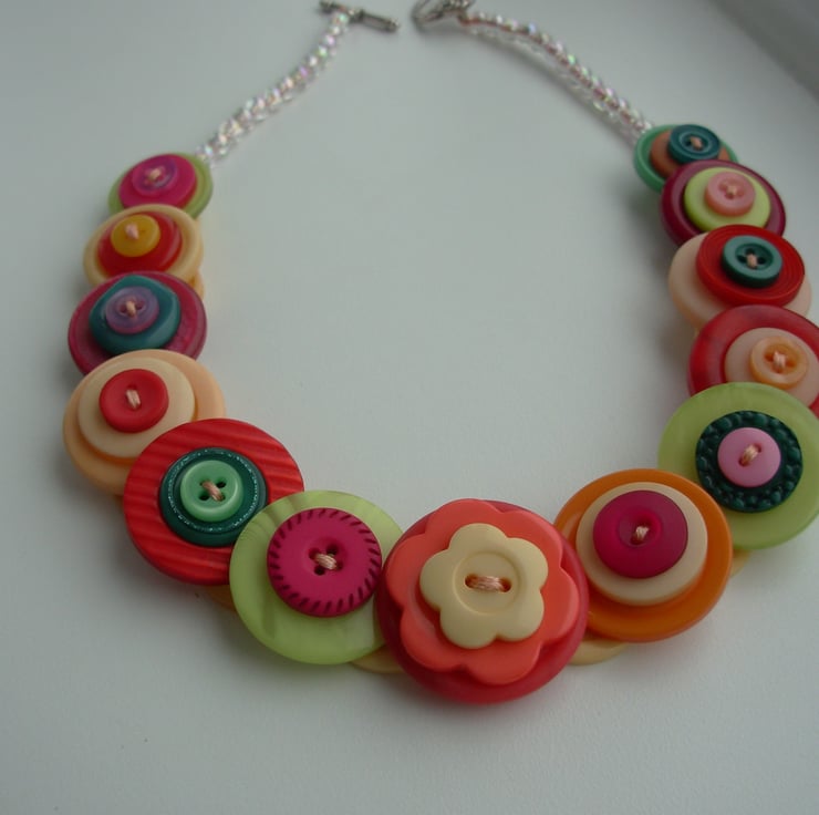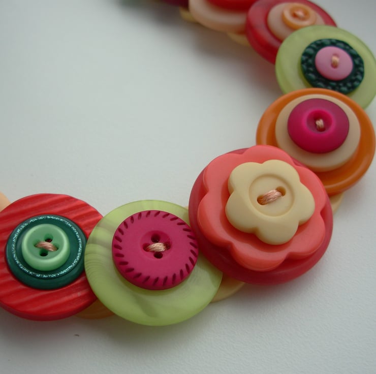I've made this layered and stacked button necklace with tropical colours buttons - threaded and knotted with 6 strands of embroidery thread and finished with little