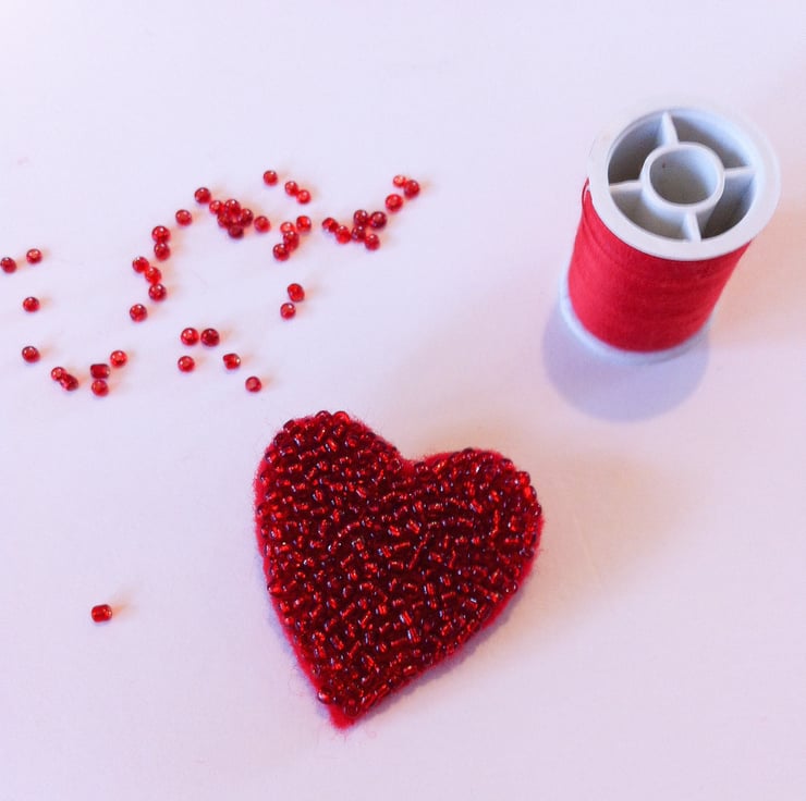 This tiny heart brooch pin is perfect for showing a little love. Hand beaded with tiny red glass seed beads, a simple heart beat of sparkle that can be worn anywhere. The brooch back is sewn to the brooch and covered with a section of red felt.