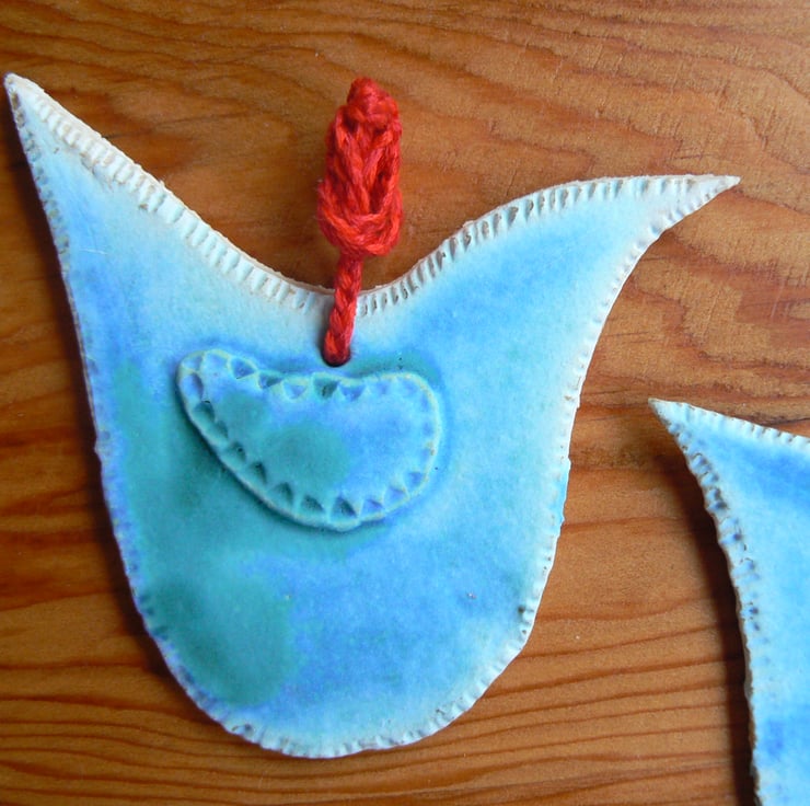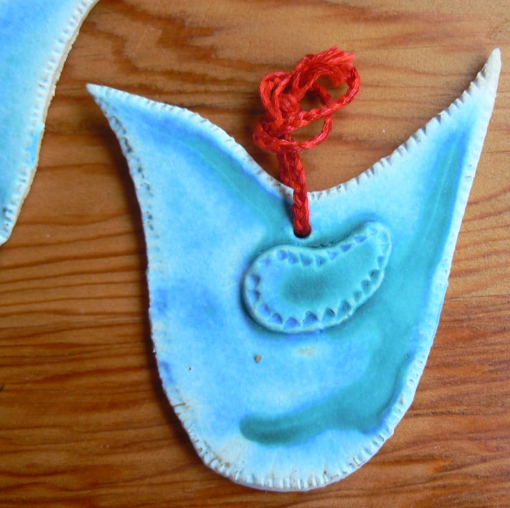 The clay I have used fires to a white colour and although quite rough in texture this brings out the colour of the dry turquoise glaze and the texture of the impressed pattern. The hanging thread is plaited from three toning colours.