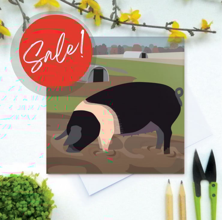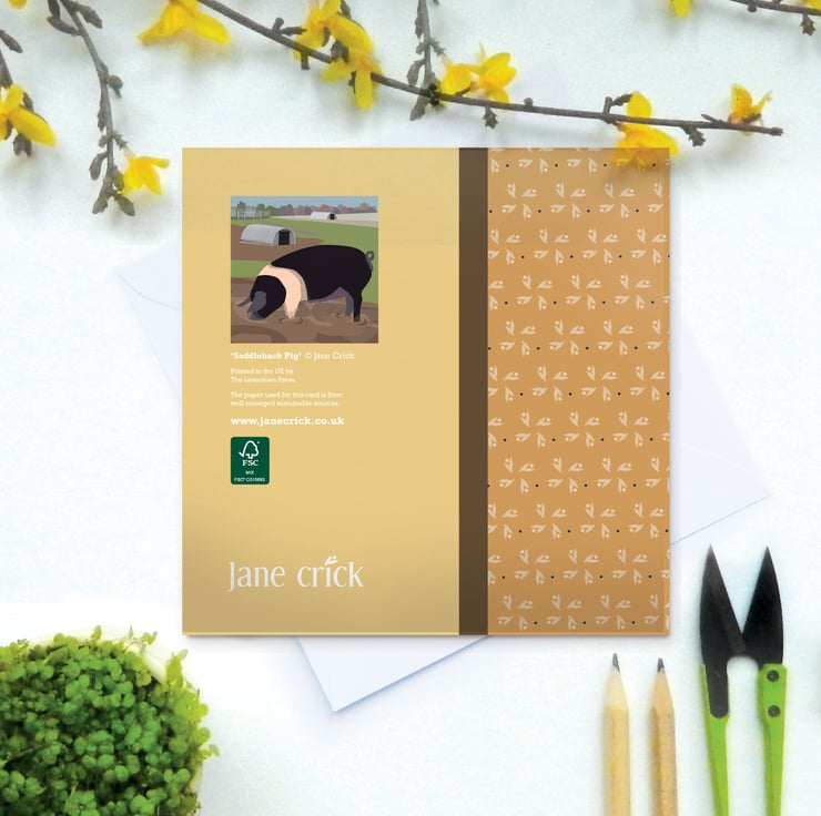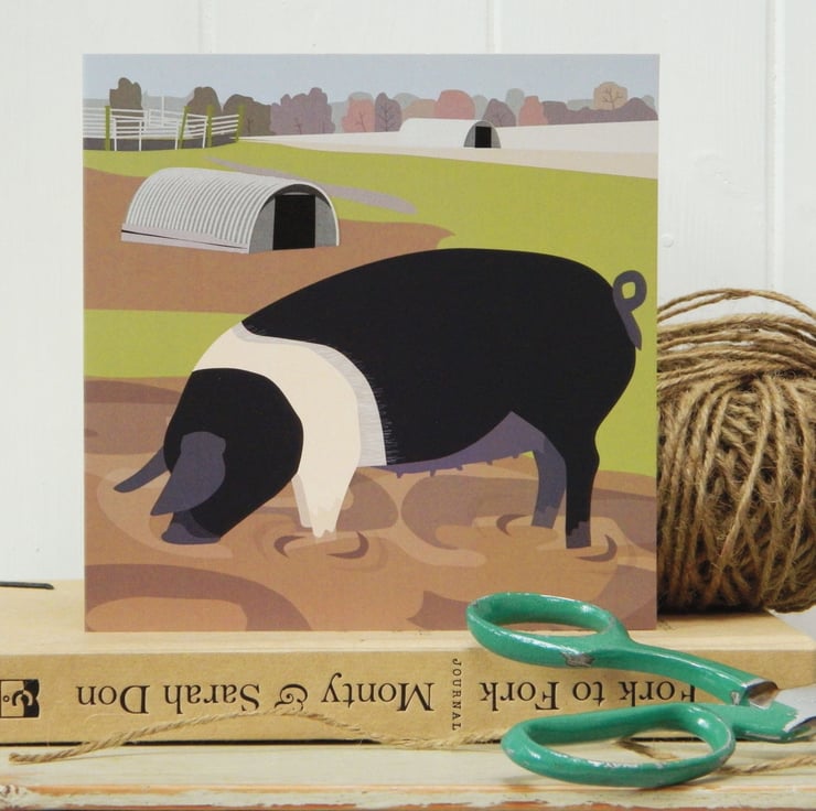Saddleback Pig card - great birthday card for anyone who loves pigs or farms! This very special rare breed pig lives on Jimmy Doherty's Farm near Ipswich, Suffolk. She had a whole heap of piglets which didn't stay still long enough to pose for me!