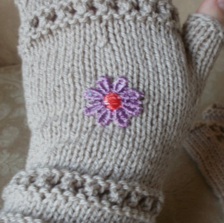 Hand knit ladies beige lace fingerless gloves with a picot edging and lilac and red flower decoration.