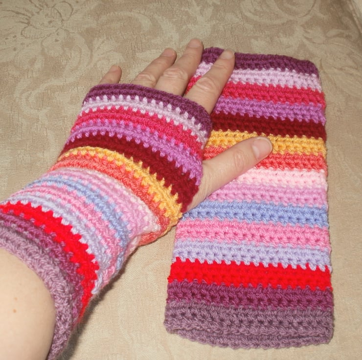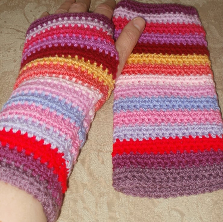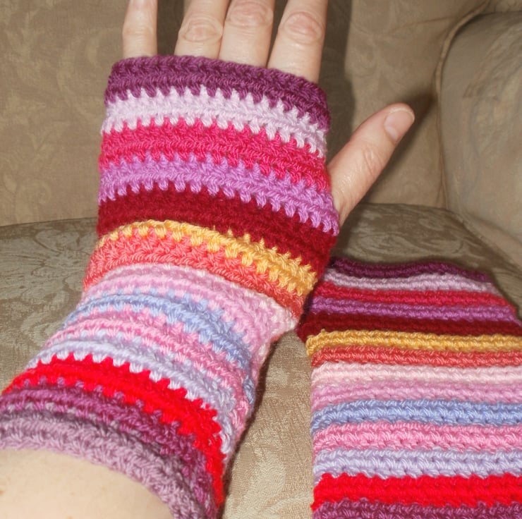 Hand crochet stripy wrist warmers in colours that will make your heart sing, even on the dreariest coldest day!