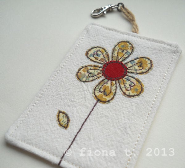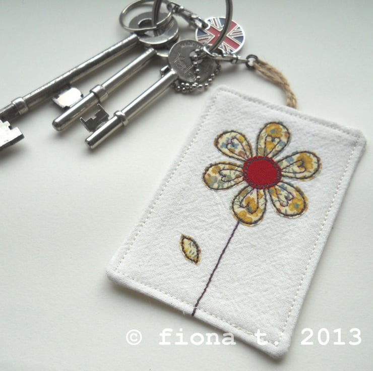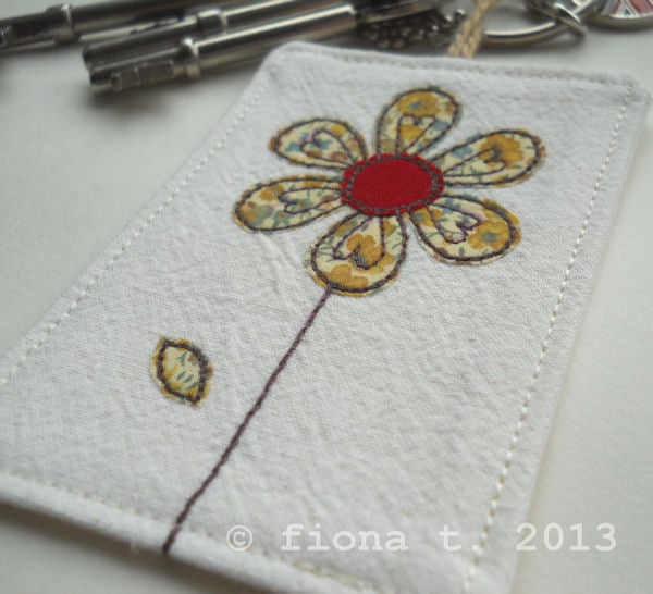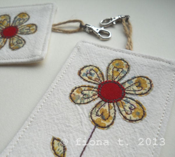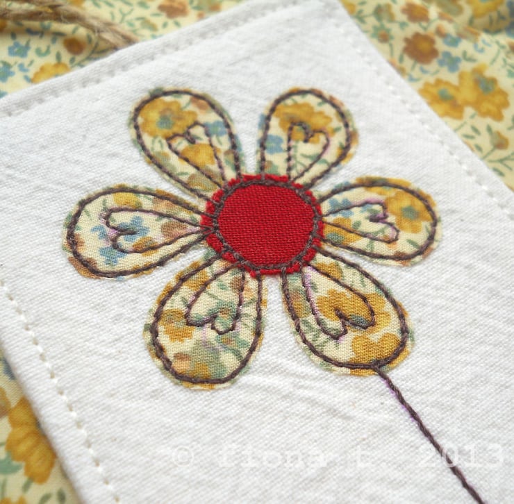 these pretty flowers are in a yellow liberty print cotton fabric with a red cotton centre. the fabrics are layered & appliqued onto pre-washed calico, before i draw on detail with free machine (free motion) embroidery.