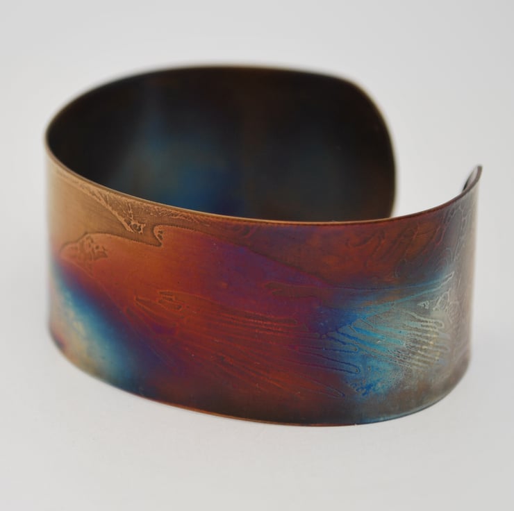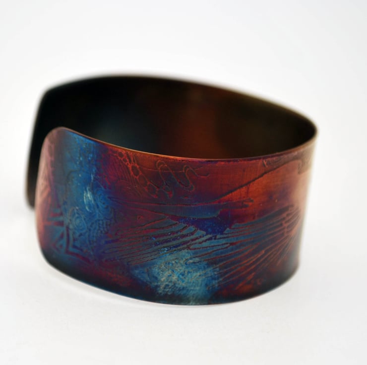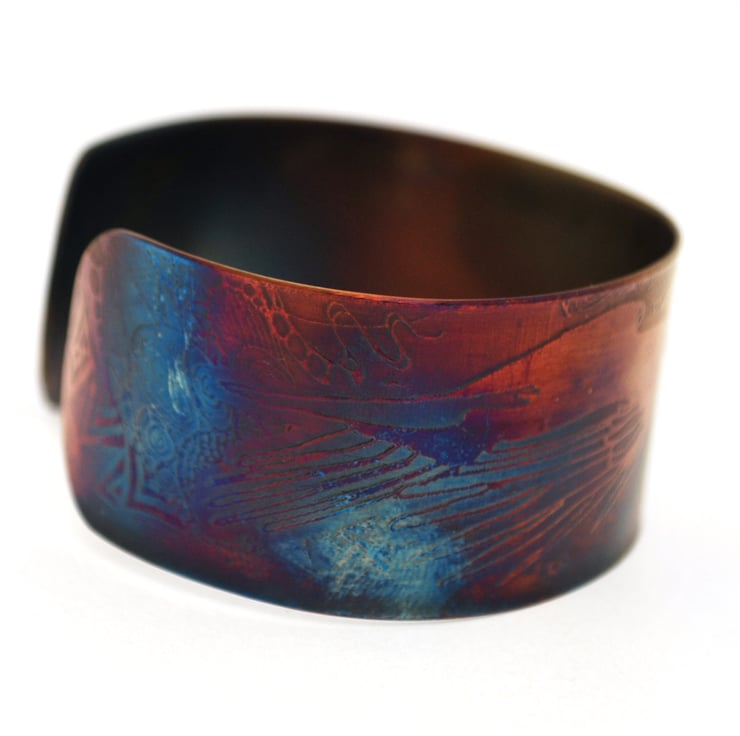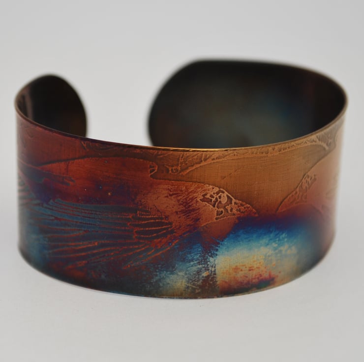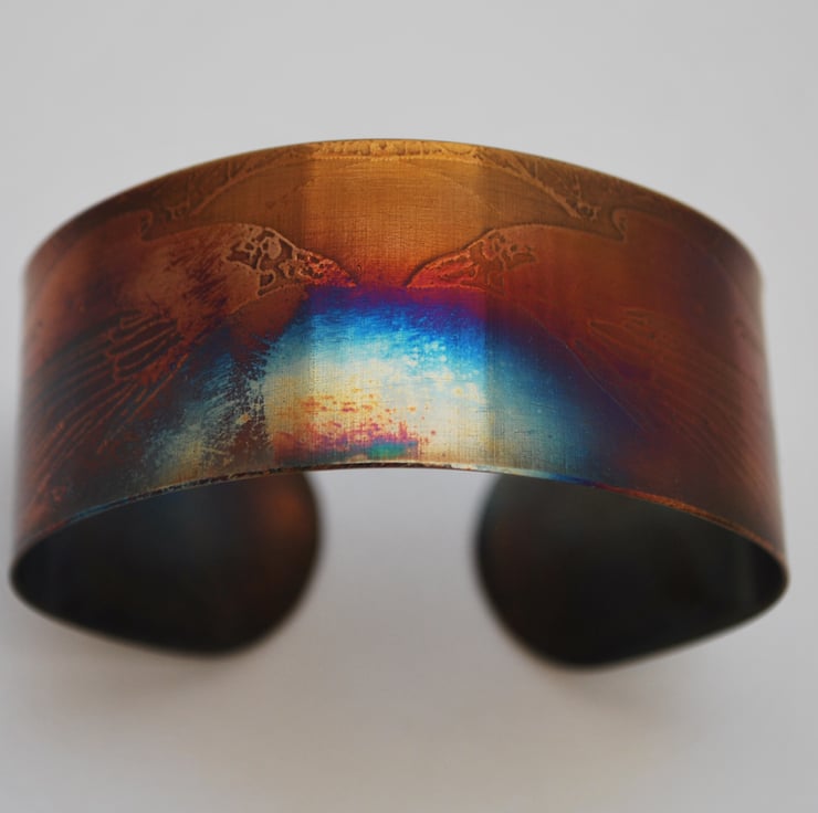 This steel silver cuff has the image of two ravens flying towards each other etched onto the surgical steel surface, polished to create definition and contrast. I use environmentally friendly etching processes when producing my designs, and each piece is subtly unique. This piece has been vibrantly coloured using a jewellers torch (a technique called 'bluing') and finished to preserve the very durable patina. This will not tarnish further as it is polished stainless steel.