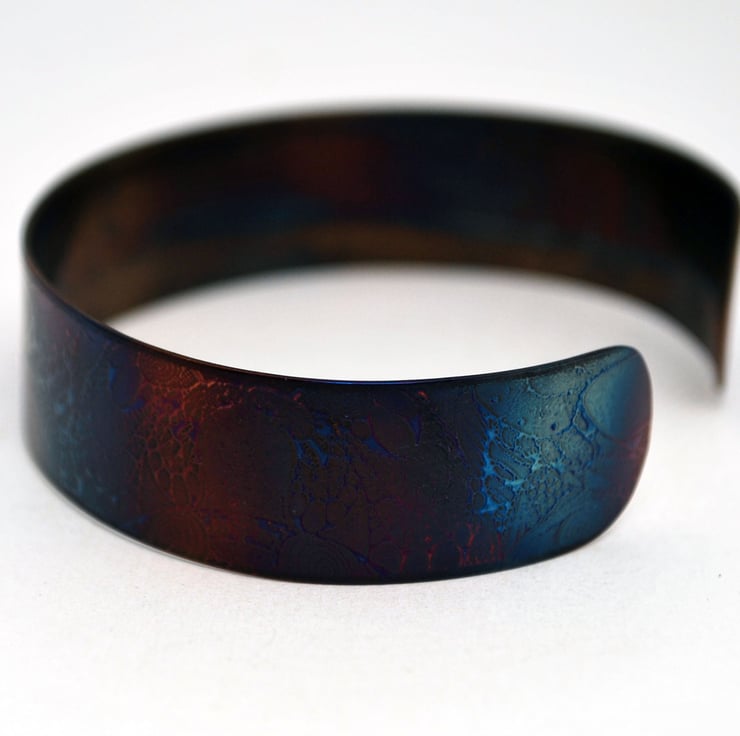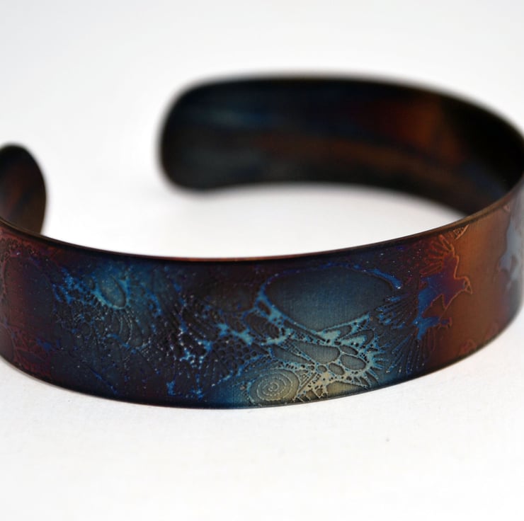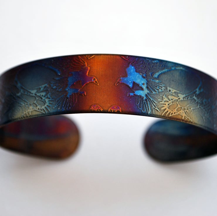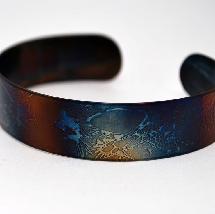 This steel coloured cuff has the image of flying magpies on a patterned background etched onto the surgical steel surface, polished to create definition and contrast. I use environmentally friendly etching processes when producing my designs, and each piece is subtly unique. This piece has been vibrantly coloured using a jewellers torch (a technique called 'bluing') and finished to preserve the very durable patina. This will not tarnish further as it is polished stainless steel.