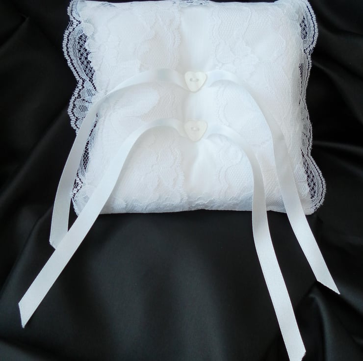 This is a beautiful and unique, delicate white lace over white satin, ring bearer pillow. The pillow has two white heart buttons and two white satin ribbons to attach your rings to. The pillow measures approximately 13cm x 13cm and is padded with soft toy filling. (Rings not included.)