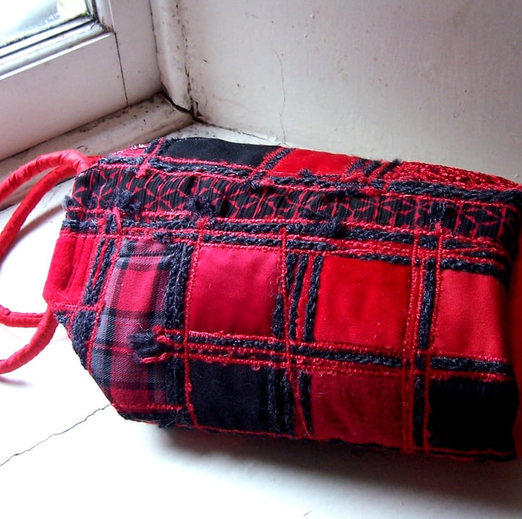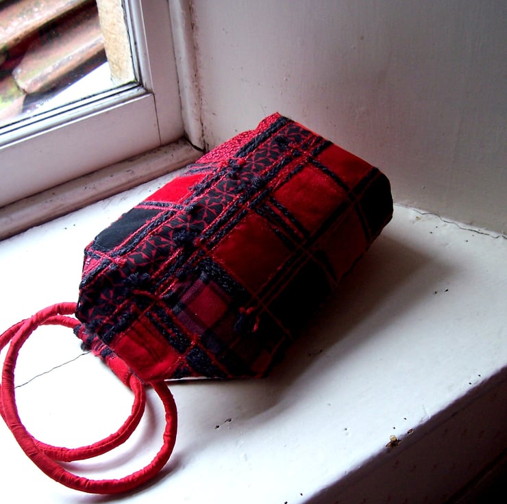Outer layer is made of a combination of red and black coloured materials, with machine embroidery and yarn appliques. Base is plain red cotton, stiffened to add stability.