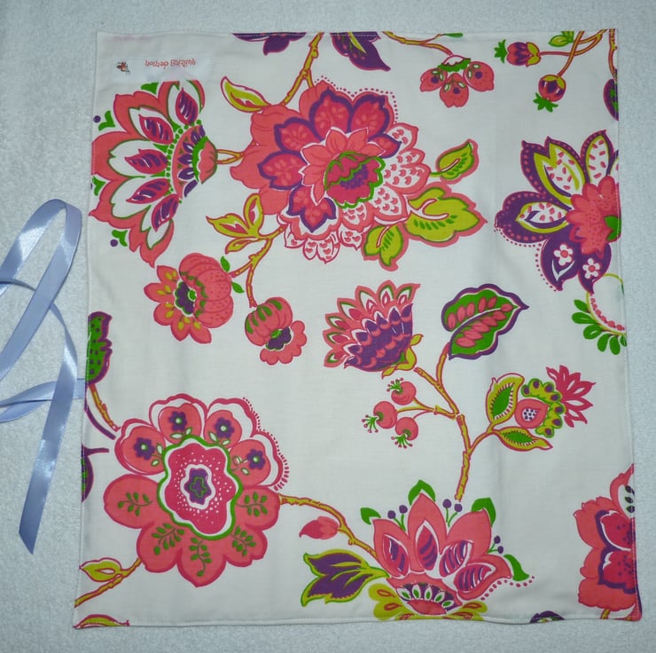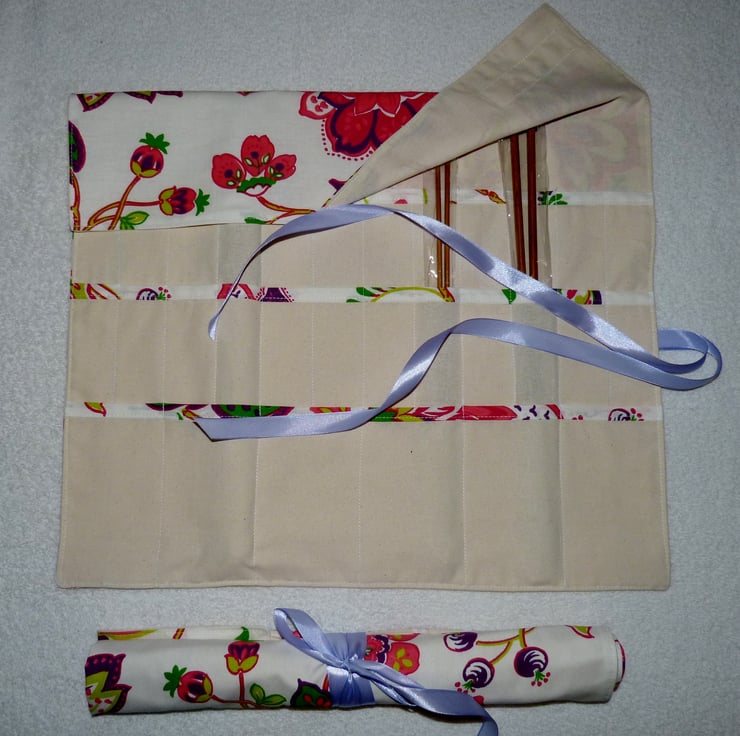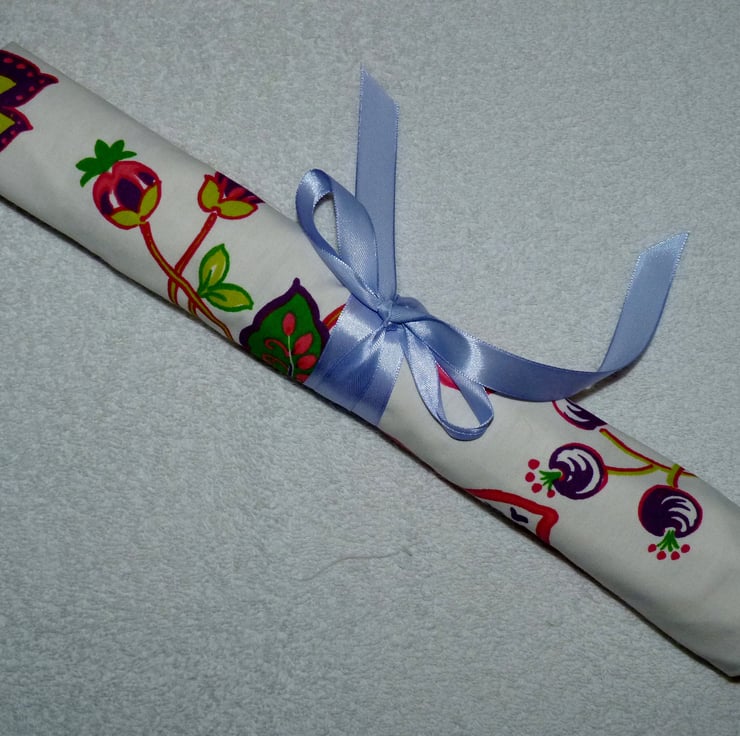 I have used a bright flowers on white design cotton print fabric to create this useful knitting needle case. The holder is lined with a plain cream cotton fabric.
