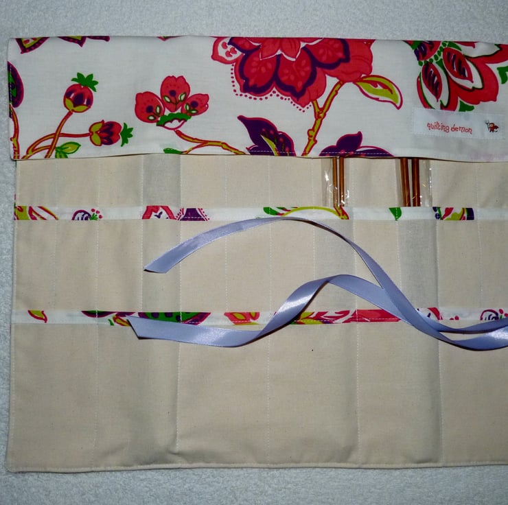 The top of the case is a flap which folds over to keep the needles safe. Once rolled up, there is a lilac ribbon to secure the holder. It is top stitched to achieve a professional finish. Total size when placed out flat is 18" x 19".
