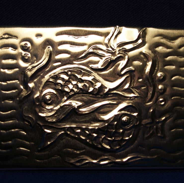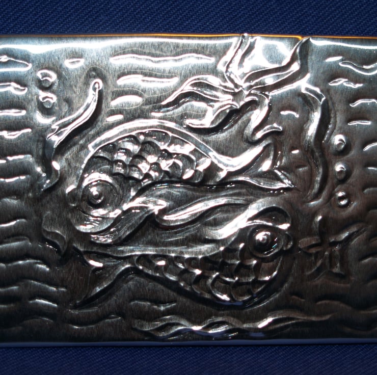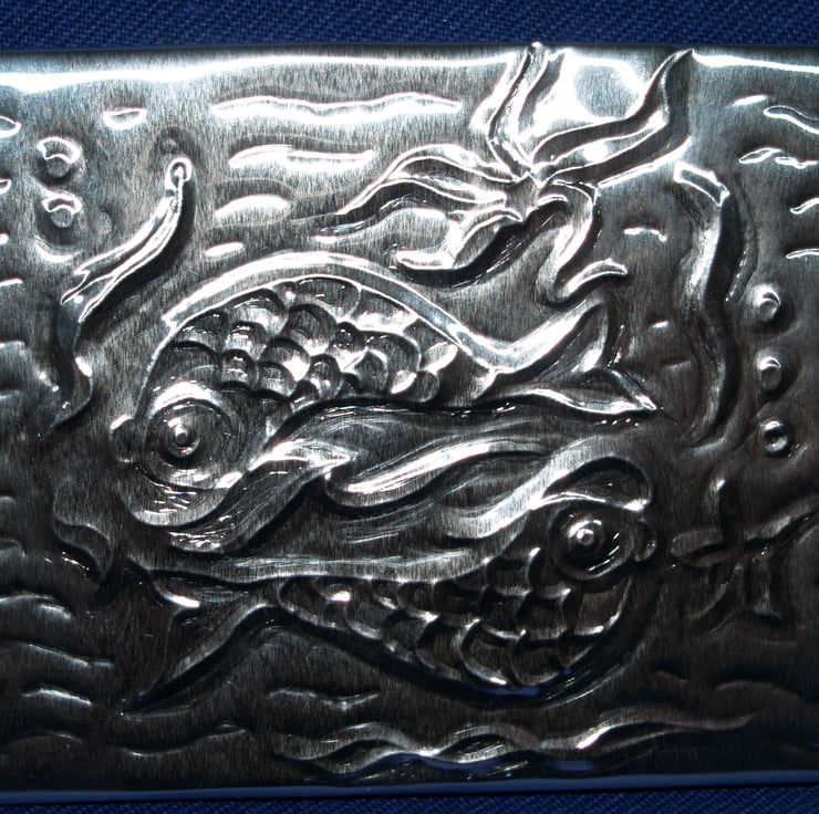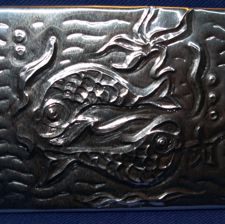 This is an original, embossed ACEO of fish. It measures 2.5 x 3.5 inches (63 x 89mm), and was created by using silver-coloured embossing foil which I have backed with stiff card, then finished with a purple felt backing.