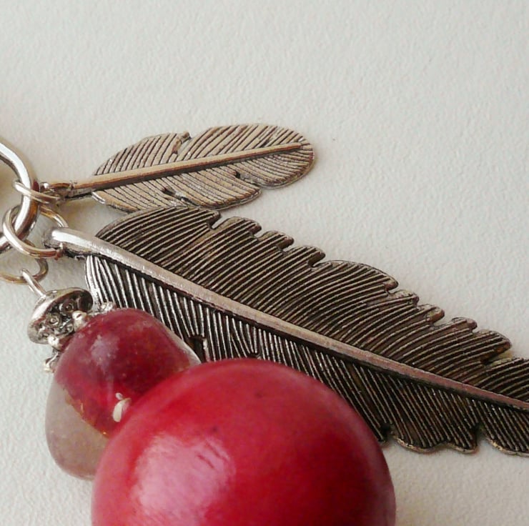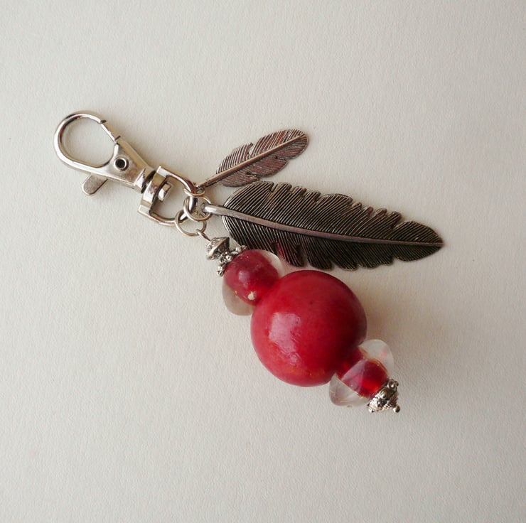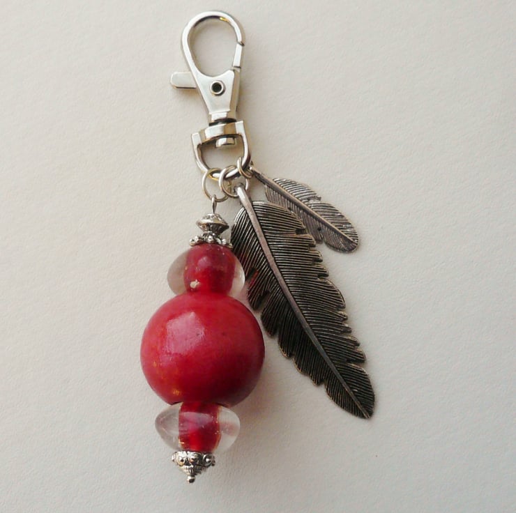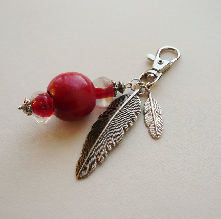 This keyring consists of a large 25mm round red wooden bead with two red foil lined glass beads either side. Bead caps, spacers and 50mm and 25mm long feather charms are all silver plated and attached to a 35mm long trigger clasp.