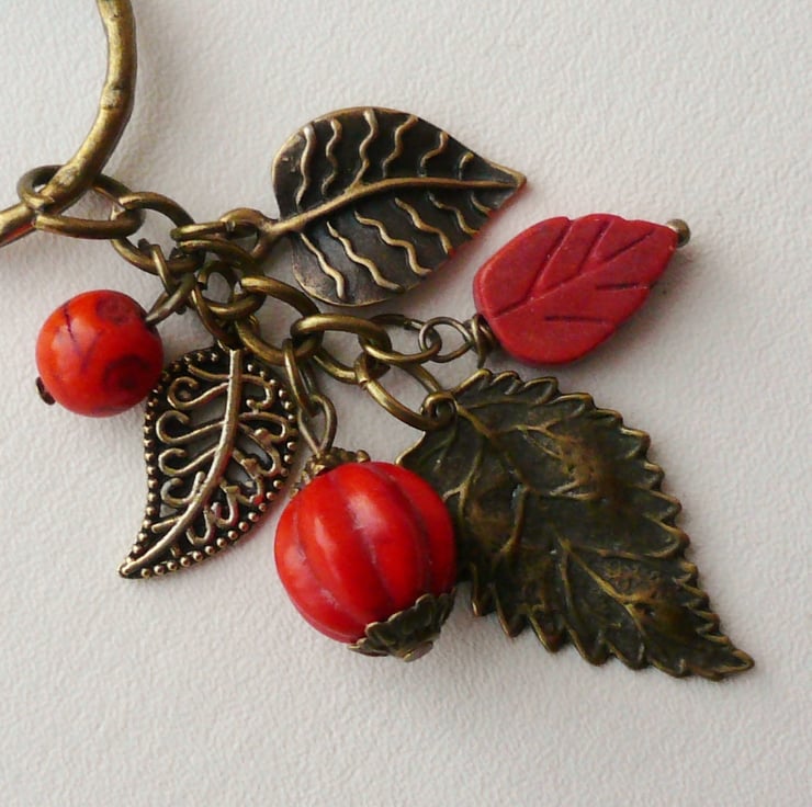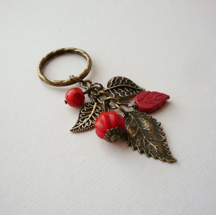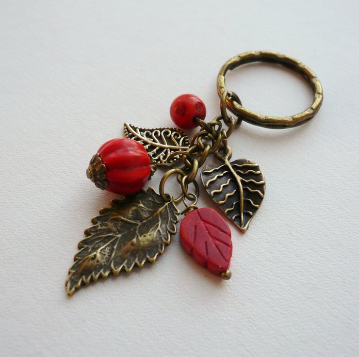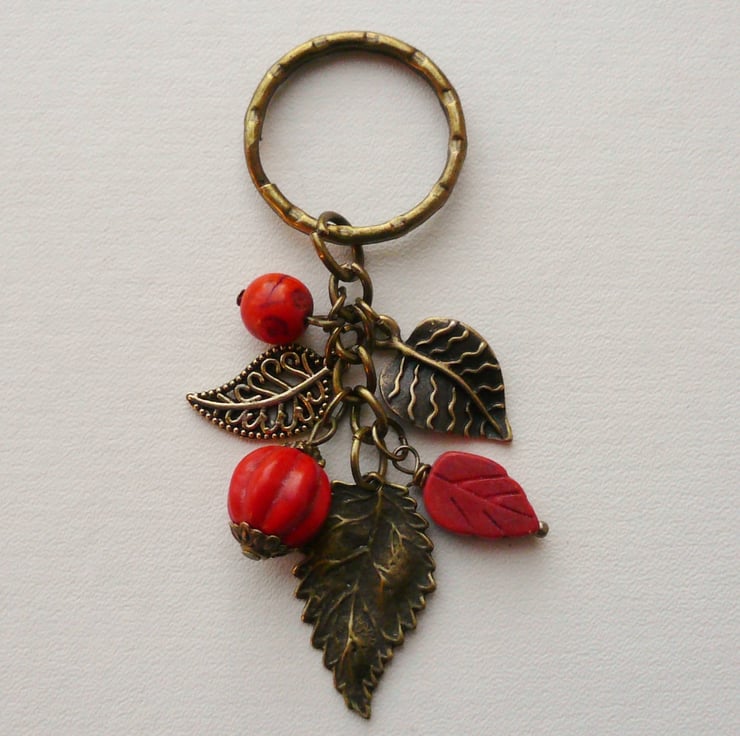 This key ring consists of three different antique bronze leaf charms teamed with three different orange howlite beads. All attached to an antique bronze 25mm ring and chain. Total length incl ring is approx 8cm.