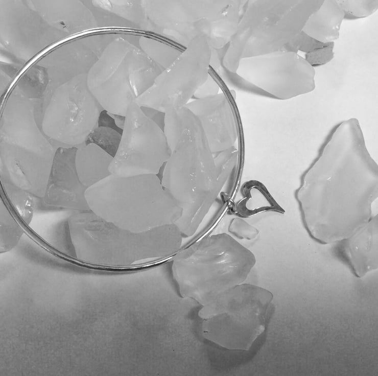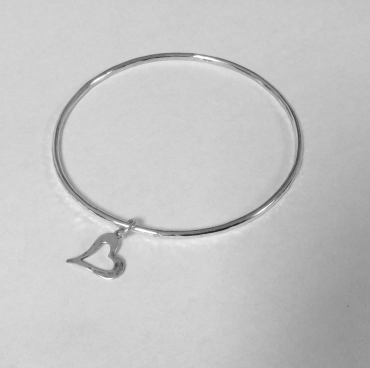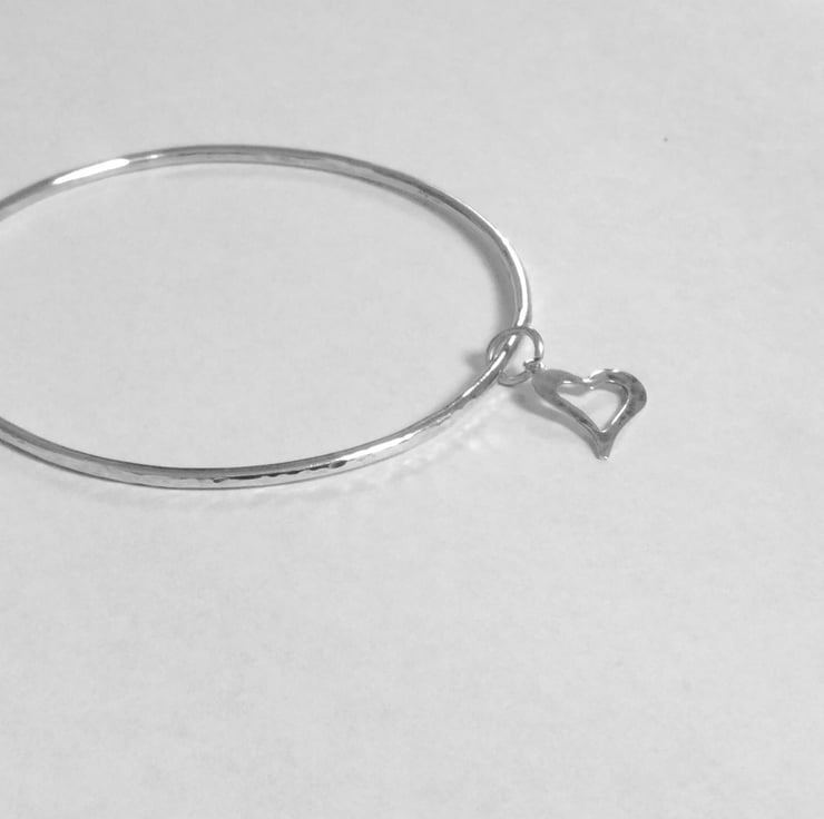 This gorgeous bangle is made from 2mm wide sterling silver wire which has been textured on the outer surface with a ball-pein hammer, creating a surface which reflects the light brilliantly. For a romantic touch I have added a heart-shaped sterling silver charm which also has a hammered finish. This would make a lovely Valentine's gift, wedding accessory or bridesmaid's gift. The bangle has been hallmarked at the London Assay Office and polished to a high shine. It is medium-sized, with an internal diameter of 6.5cm. The heart charm is 1.2 x 1.5cm.