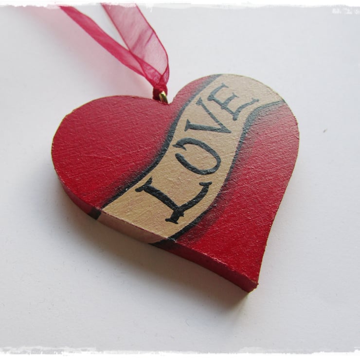 Painted in a deep red with a caramel coloured banner with the word LOVE painted on. There are 3 small hearts painted on the back.