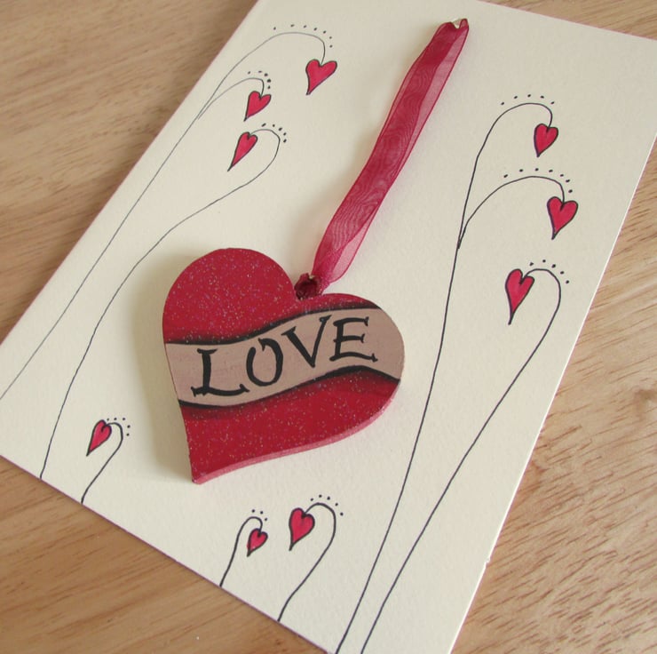 Gift & Card in one. Handpainted Love Heart for Hanging anywhere you so desire. Ideal for Mothers Day or Valentines Day as a token of your love. Comes attached to a card so it is both Card & Gift in one.