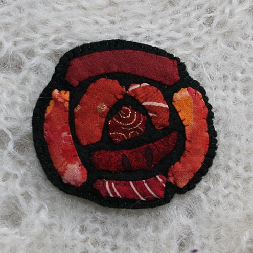 Coordinating shades of red fabric, hand appliqueed onto a black felt background, blend together to from the design for this brooch.
