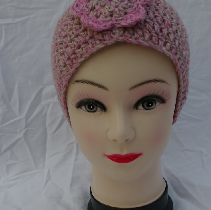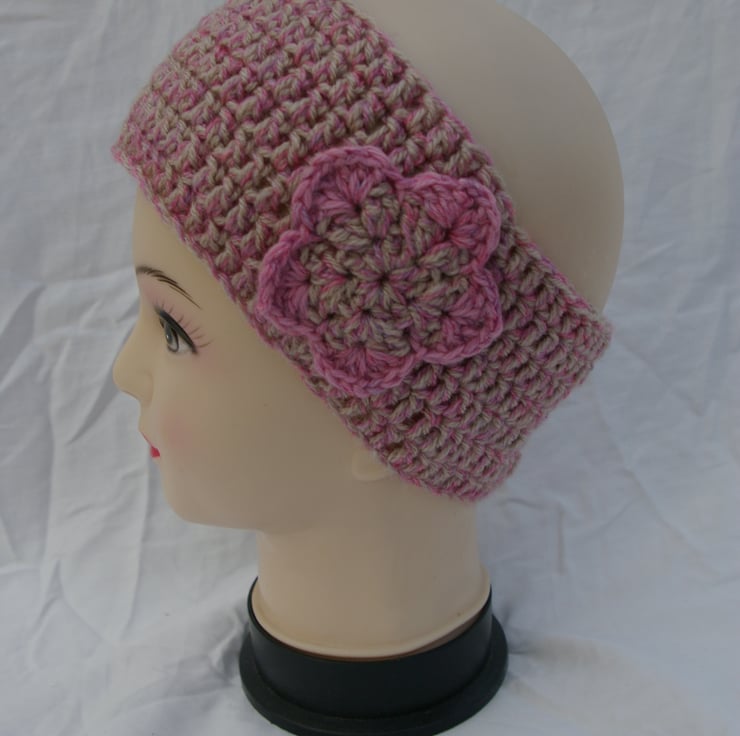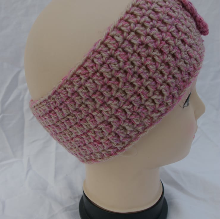 An Ear Warmer Headband hand crocheted in a mix of Fawn and Pink yarns. The band is decorated with a hand crocheted Flower emblem which has been hand sewn onto the Ear Warmer Headband. The two different yarns have been chosen to create this lovely, warm and pretty item are a mix of cotton and Acrylic and 100% Acrylic. The flower works well worn either to one side or to the front.