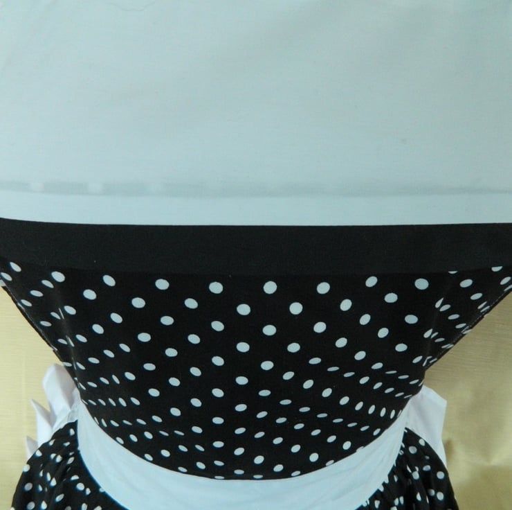 Here we have a lovely cotton rich black and white polka dot with white trim retro style apron, handmade in house to our own design. (see photos). Adjustable neck and waist ties so will fit up to a size 22.