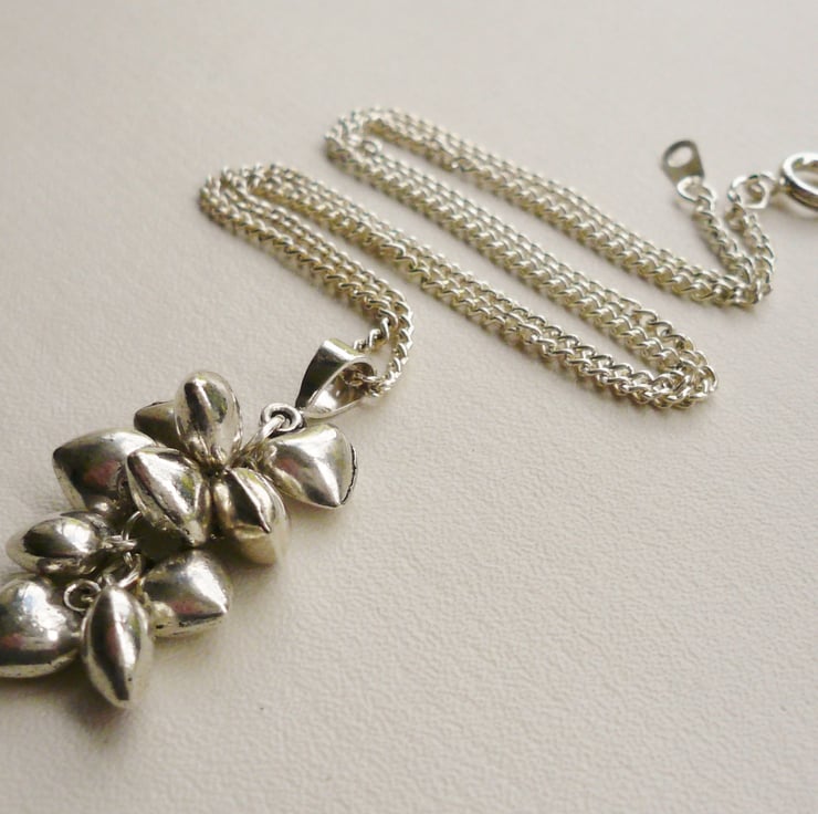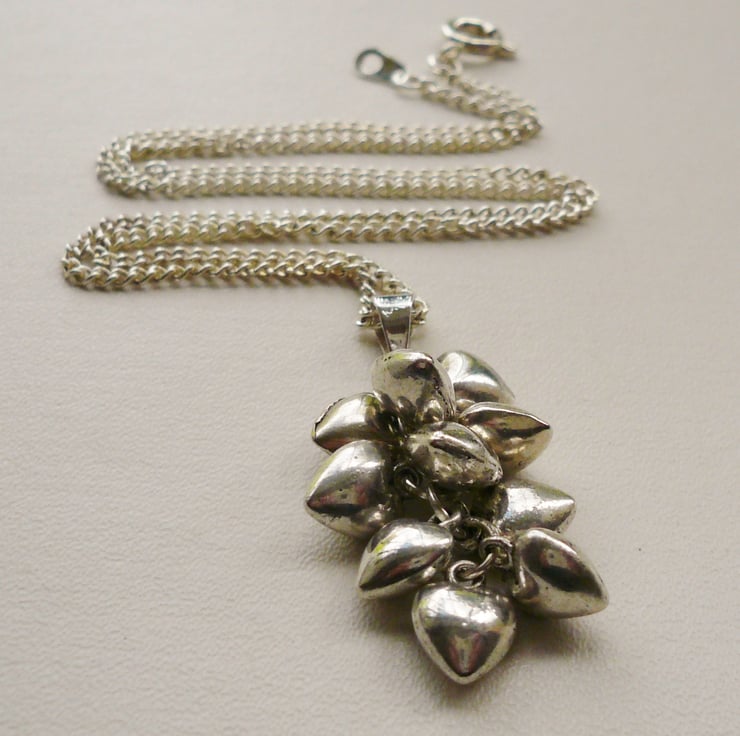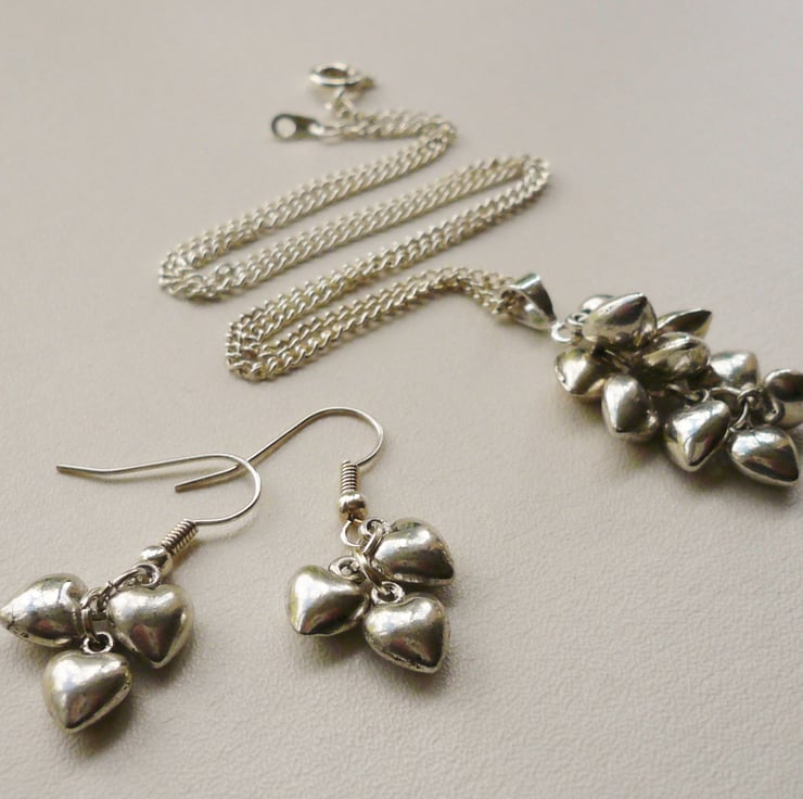 The necklace in this set is simply a cluster of ten 6mm Tibetan silver puff hearts hanging from a silver plated pendant bail and chain with bolt ring clasp. Length of cluster from chain incl bail is 3.5cm. Lemgth of necklace incl clasp is approx 41cm.