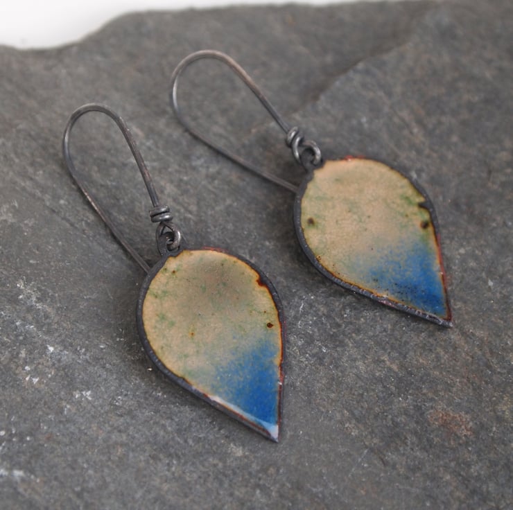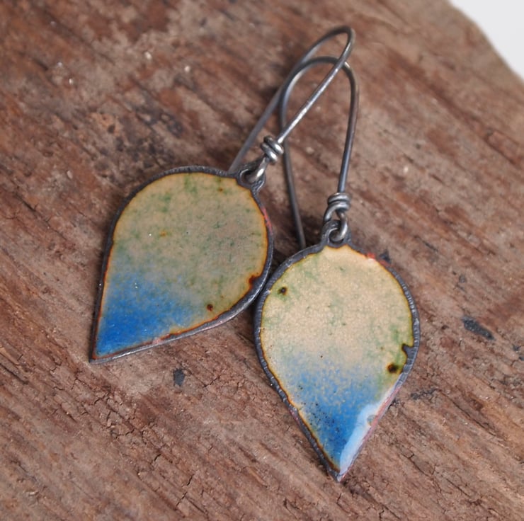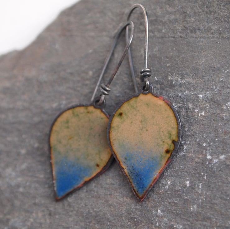 I have carefully sifted layers of fine, lead free, vitreous enamels onto copper leaf shapes and then fired them in a kiln between each layer to build up the rich colours in these earrings. They are a lovely earthy mix of ochre, rust, green with warm coppery hues showing around the edges and blue tips.