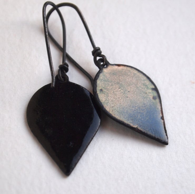The handmade ear wires are sterling silver that has been oxidised to give a complimentary smokey grey tone. The earrings have been enamelled on the reverse (counter enamelled) with several layers of black enamel.