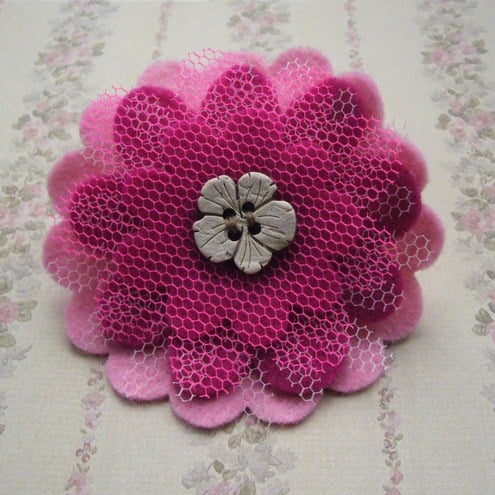 Flower shapes in net and felt are layered up then handstitched together & topped with a flower shaped button. A Heart is sewn on the back with a 20mm brooch pin to secure it to a winter coat, hat, bag... cushion or even instead of a bow on an EXTRA special pressie..