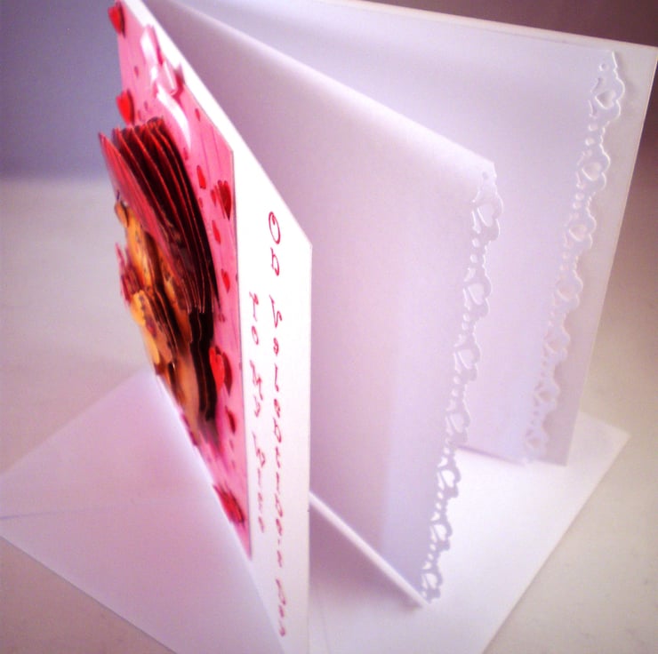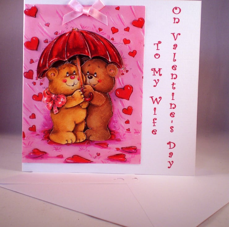 A white square card measuring 144x144 (5.5x5.5in) has two cute teddies in love cuddling under an umbrella. The images are decoupage/3D and the greeting is printed in red directly onto the card. Insert is white with a heart punched border . There is no message in the card