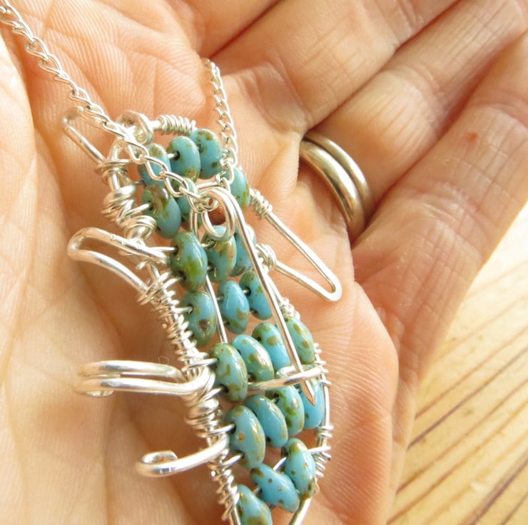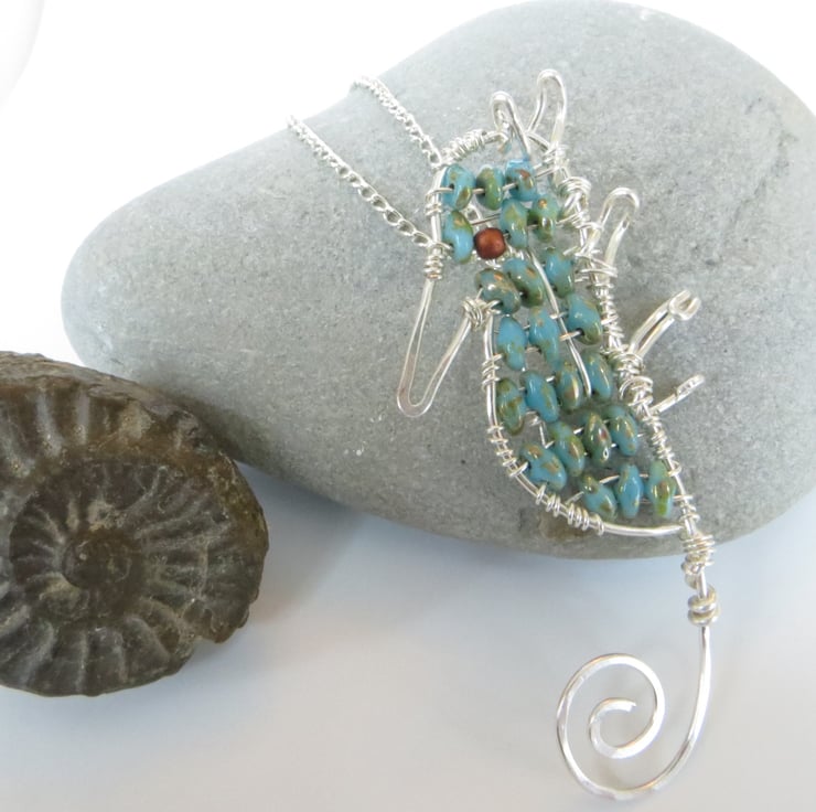 This seahorse necklace has been handmade by forming the silver plated wire into shape, hammering it for strength and has then been filled with the most gorgeous shimmery picasso finished turquoise beads, with a teeny little copper bead for an eye. I have added a handmade brooch pin to the back, then threaded through a fine silver plated chain which is easily removable, making this a really versatile piece of jewellery. This would make a lovely one of a kind gift for any seaside lover!