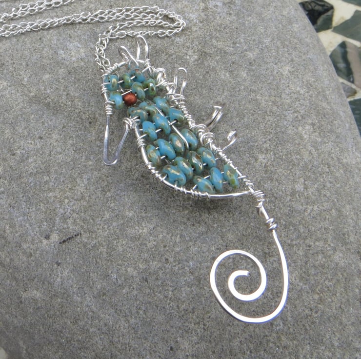I love anything to do with the sea, in particular seahorses, and this piece is inspired by a large wall hanging my husband and I bought while on honeymoon in Cornwall (many years ago!). I made the beaded seahorse first and couldn't decide between turning it into a necklace or a brooch - in the end I decided on both!