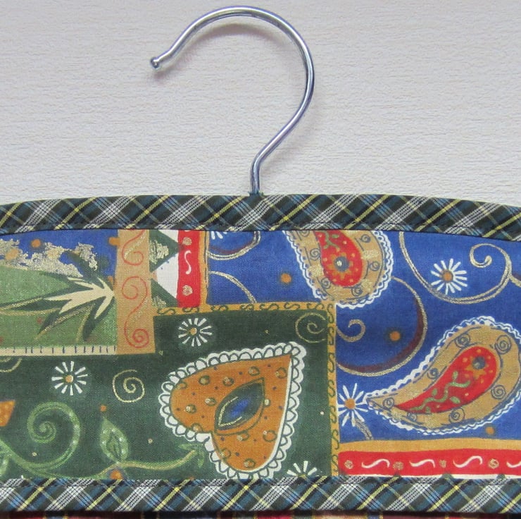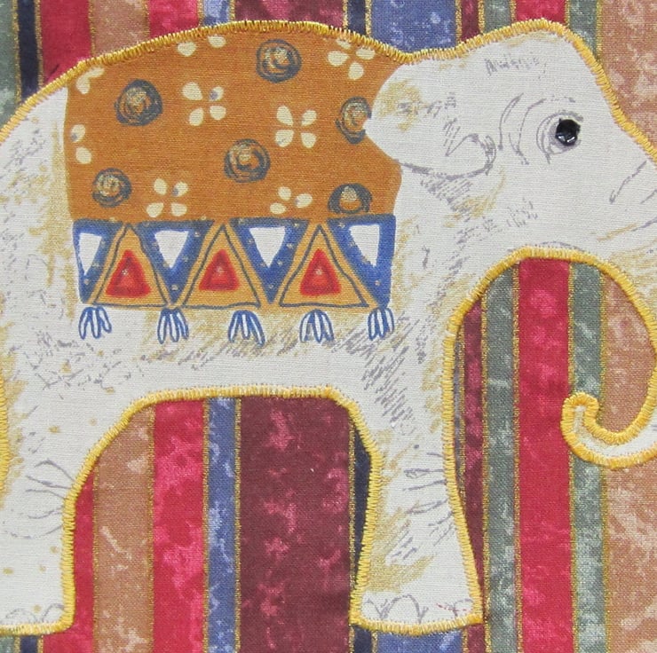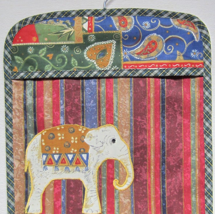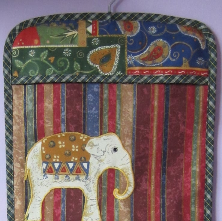 Peg bag in multi coloured striped fabric, appliqued with an elephant with black sequin eye. Edged in green check bias binding and lined in rust and cream stripe. Plenty of room for lots of pegs, it measures 29.5 cm and 33 cm long. Hangs with a strong wooden coat hanger.