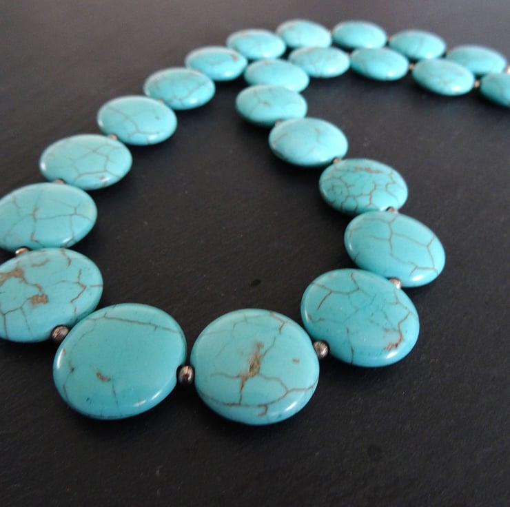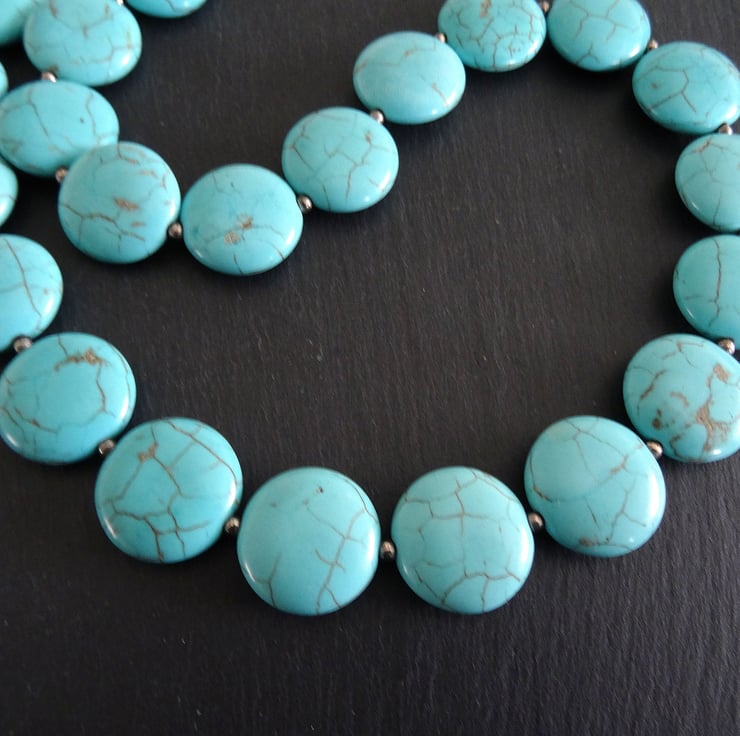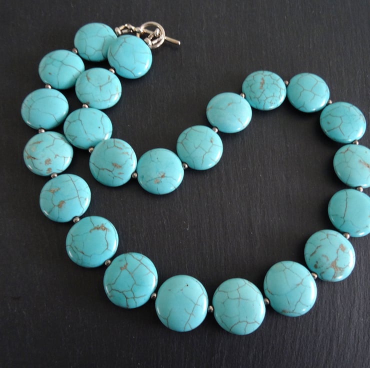 This is a lovely turquoise puffy coin necklace, the turquoise beads measure 2cm and are interspersed with 2mm sterling silver round beads. The necklace lays flat to the neck and is 18" (46cm) long finished with a silver toggle clasp. As all of the jewellery in my shop are individual pieces made by myself, this is the necklace you will receive. It will arrive gift wrapped in tissue paper and a organza bag.