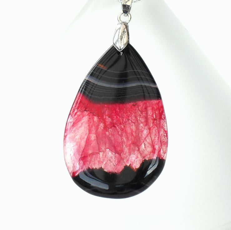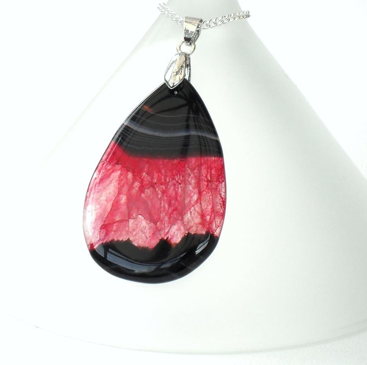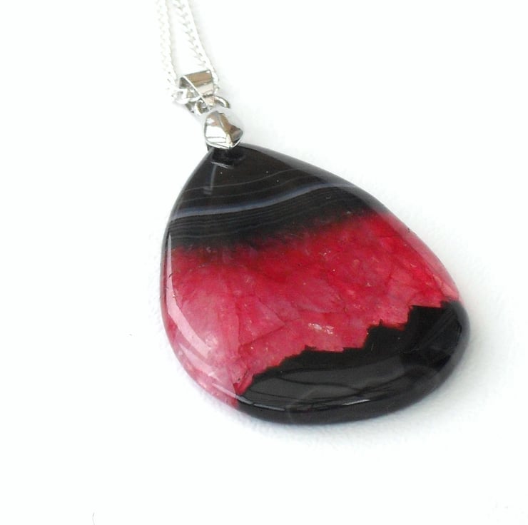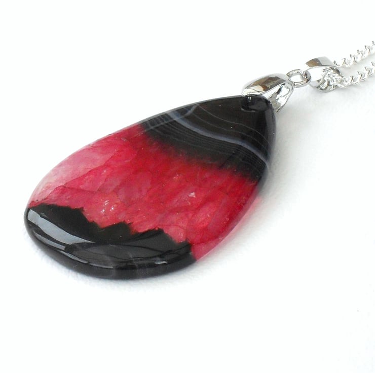 A beautiful red & black agate pendant hangs from a silver plated chain.
