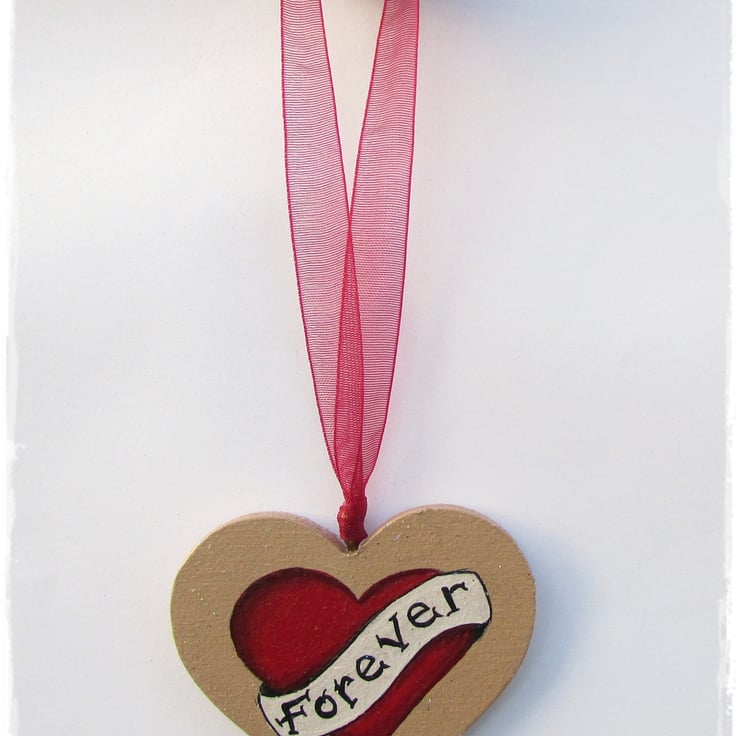 Painted in a lovely caramel with a Deep Red Heart and a Cream coloured banner with the word Forever' painted on. There are 3 small hearts painted on the back.