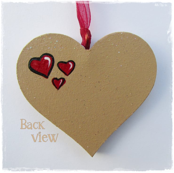 This Heart has been handpainted onto mdf with acrylics and finished off with a coat of varnish and a smidgen of sparkle. It has a lovely ribbon attached so you can hang it anywhere around the home, on a door handle, a headboard or dressing table mirror are just some places it would look good.