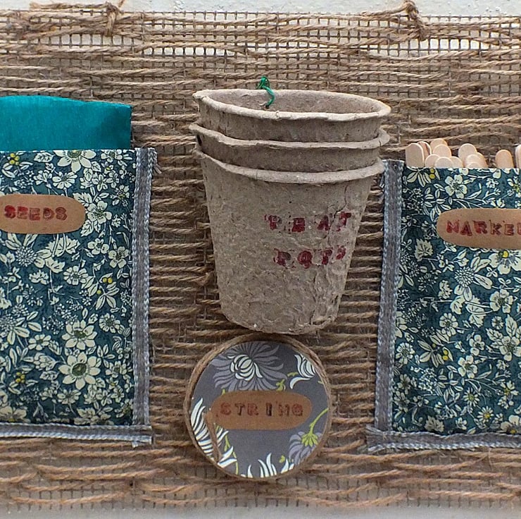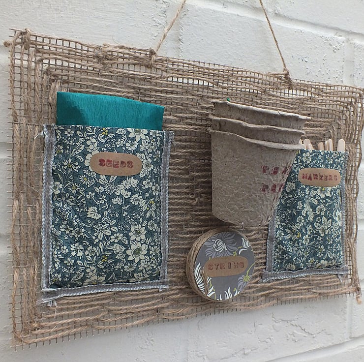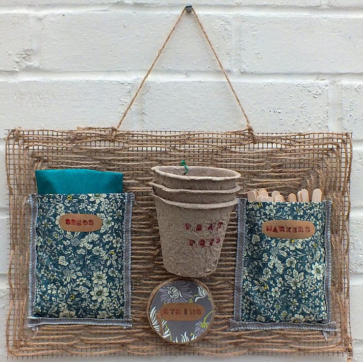 The holder itself is approx 35 x 20 cm and consists of jute string woven over a plastic mesh. To finish, a jute cord creates a hanging loop. The pockets are quite small and should only be used for little things (loose sachets of seeds, plant markers etc).